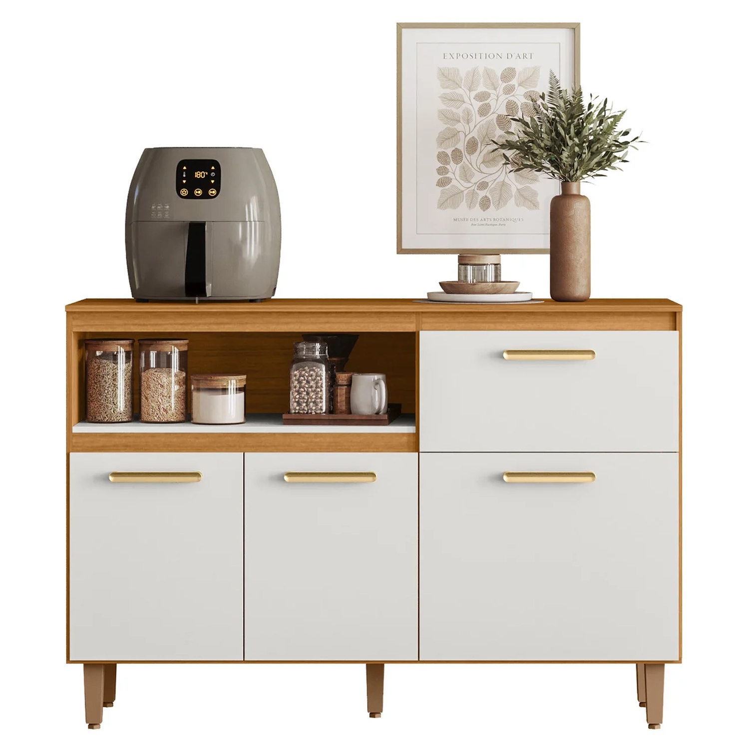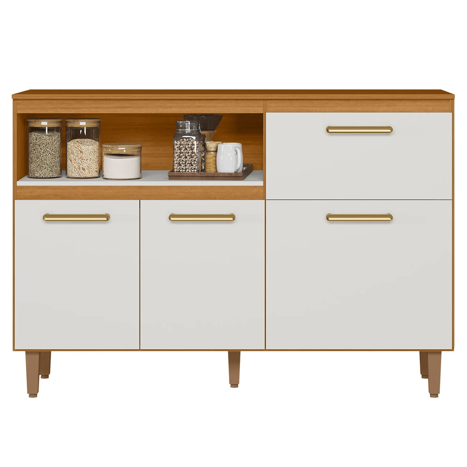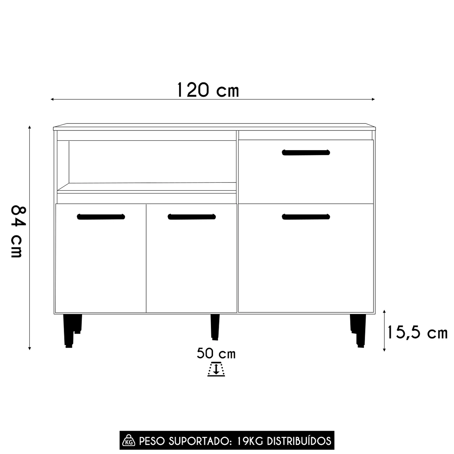 O Balcão possui três portas com dobradiças metálicas, que proporcionam um movimento suave, enquanto os puxadores em polímero harmonizam com diversos estilos de decoração. A gaveta vem com corrediças telescópicas que permitem abertura total, facilitando o aceso aos itens armazenados.