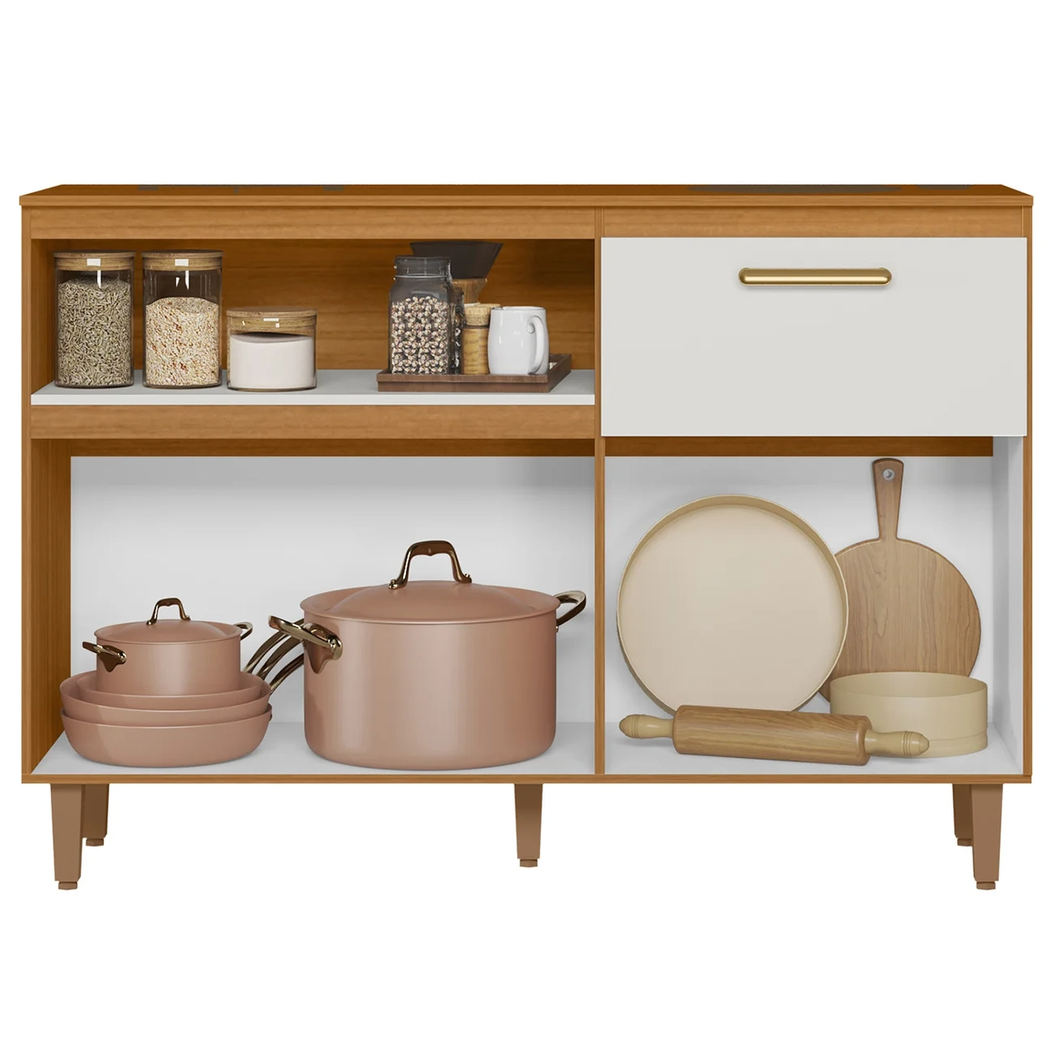 O tampo serve como apoio para eletrodomésticos, como micro-ondas ou cafeteira, e o Nicho organizador logo abaixo confere praticidade ao design, ideal para armazenar pequenos itens ou objetos decorativos. Além disso, o Balcão de Cozinha tem amplo espaço interno para guardar utensílios e panelas com eficiência.