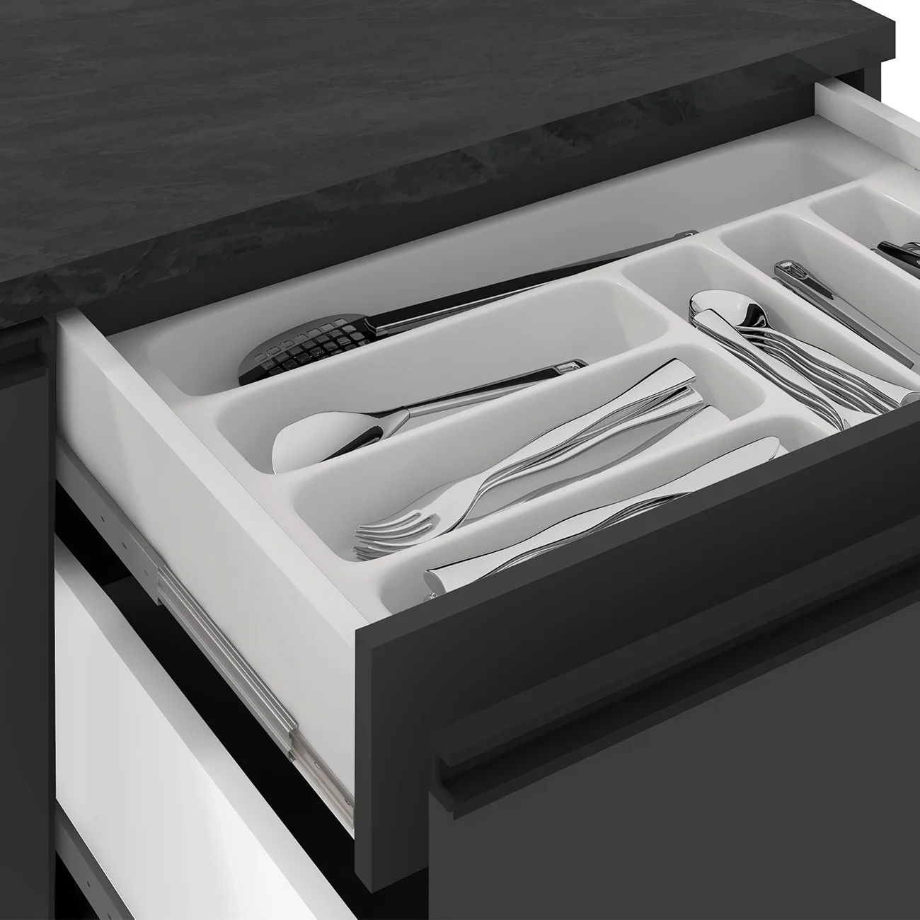 Conta com uma porta com dobradiças metálicas reforçadas, que proporcionam um movimento suave, além de duas gavetas externas e uma interna com divisor de talheres. As corrediças telescópicas permitem uma abertura total, facilitando o acesso aos itens armazenados.