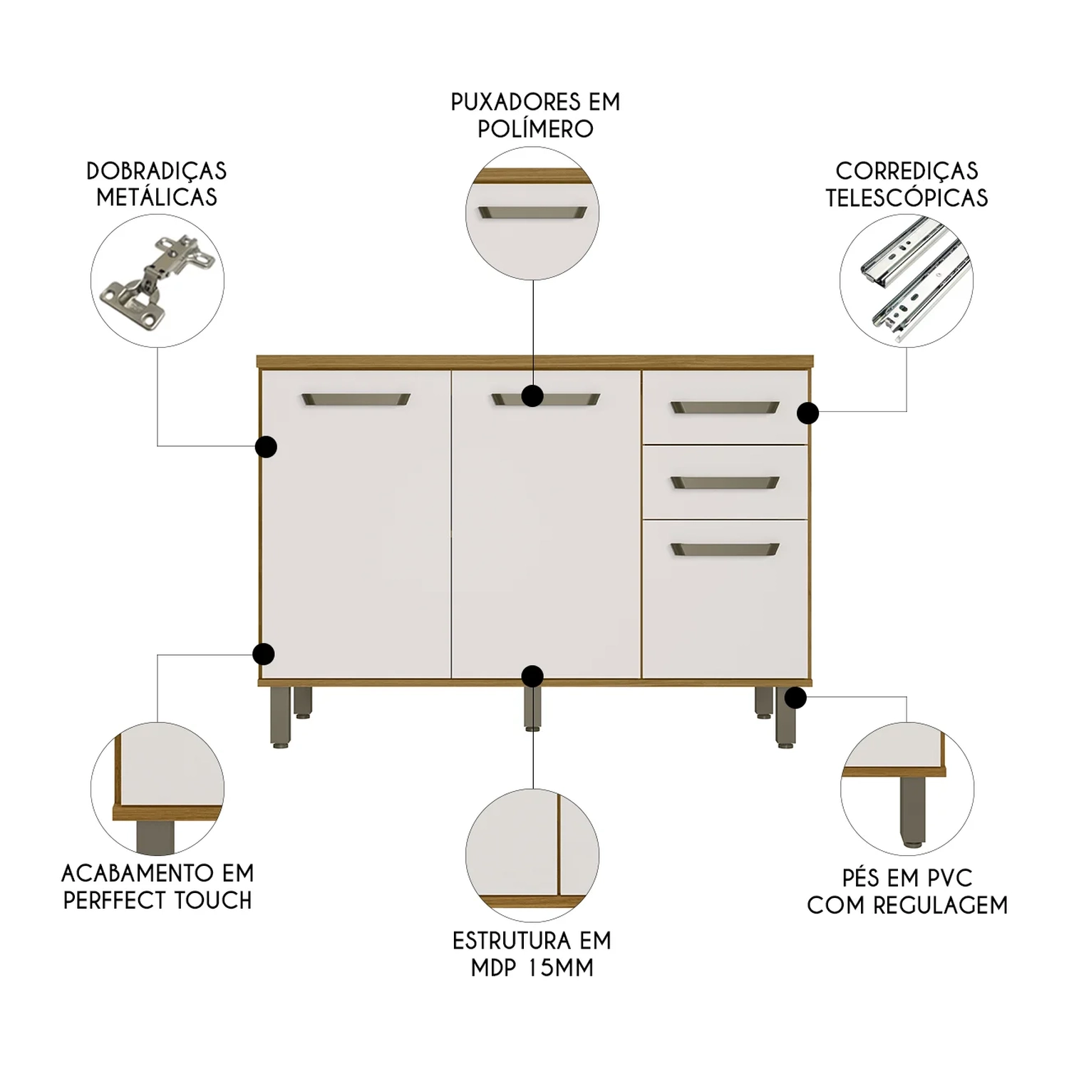 Dispõe de três portas com dobradiças metálicas reforçadas, que proporcionam um movimento suave e maior durabilidade no uso cotidiano do Balcão Com Tampo. As duas gavetas com corrediças telescópicas possuem abertura total, garantindo fácil acesso aos itens armazenados. Os puxadores em polímero conferem um toque sofisticado ao Balcão, combinando super bem com diversos estilos de decoração.