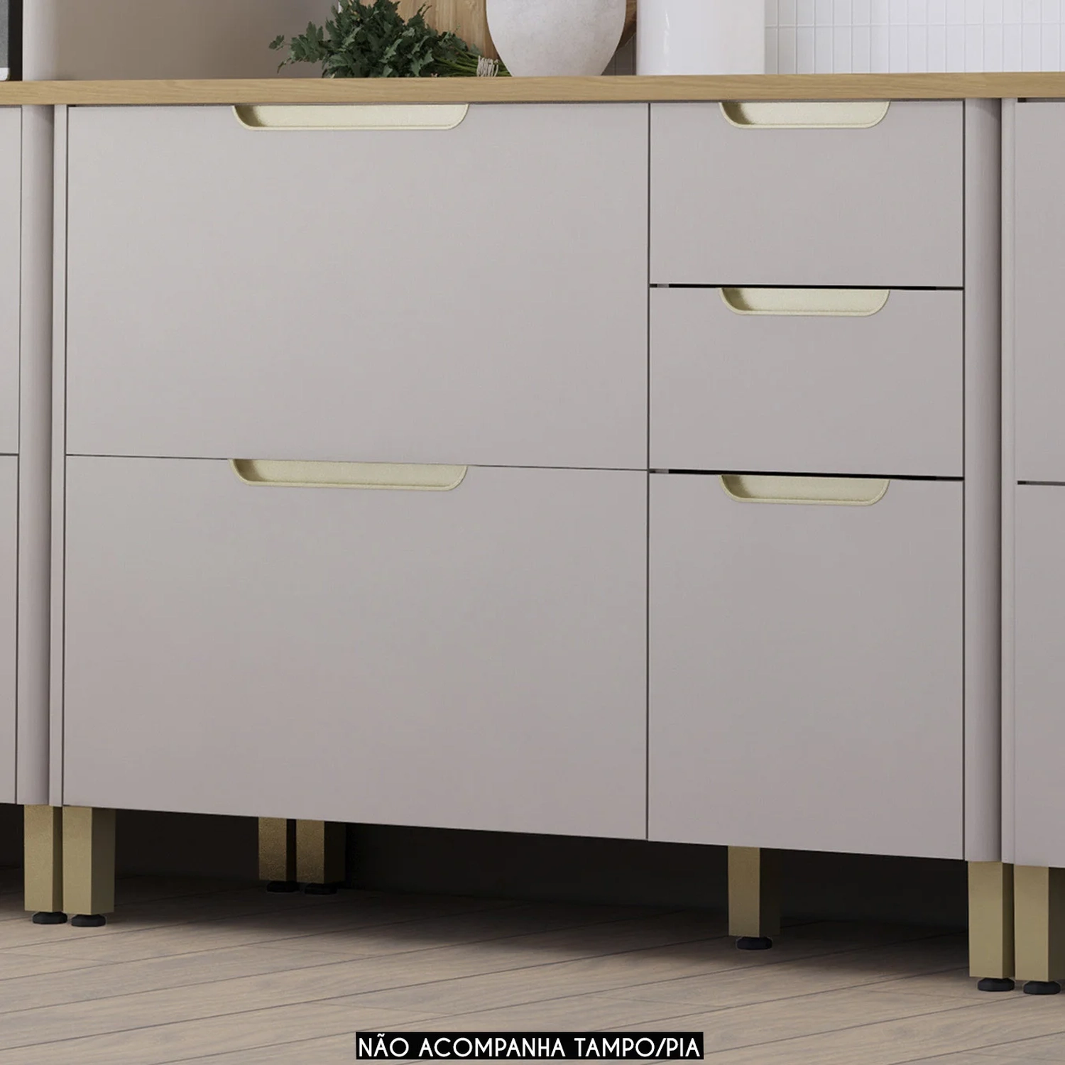 Os pés com regulagem de altura proporcionam mais estabilidade e permitem o ajuste ideal ao seu espaço. Um móvel completo, pensado nos detalhes, que traz beleza, versatilidade e qualidade para a sua cozinha.