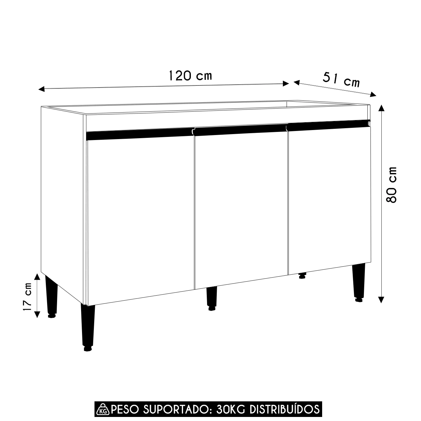 O Balcão Gabinete conta com três portas com dobradiças metálicas e uma prateleira interna, garantindo um espaço de armazenamento inteligente para utensílios, mantimentos e objetos do dia a dia.