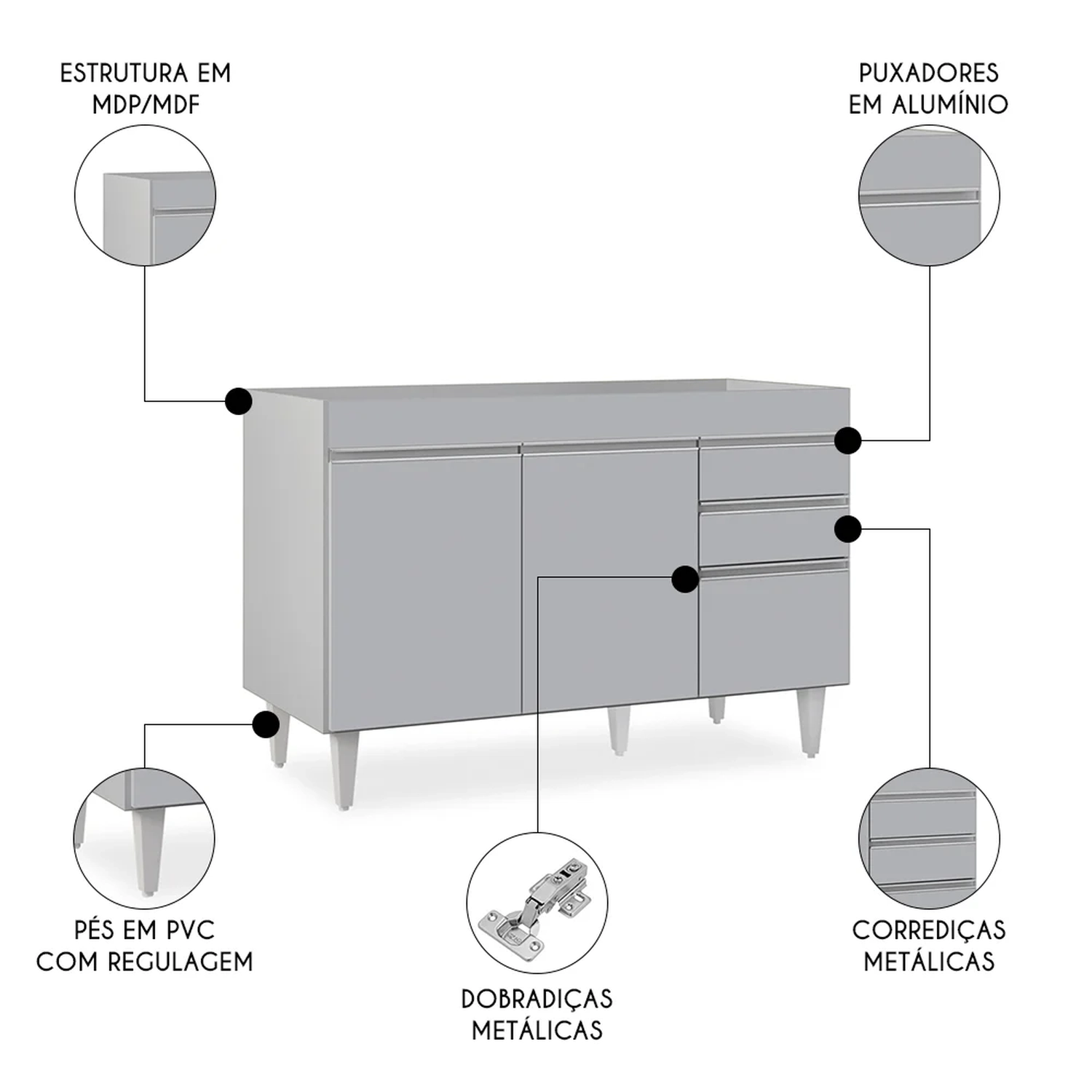 Por ser um cômodo onde praticidade e funcionalidade são conceitos que devem andar juntos, a Cozinha muitas vezes é onde mais ficamos em dúvida sobre os complementos, não é? Mas que tal começar pelos itens essenciais como o Balcão Para Pia? Sim, o balcão é uma ótima alternativa por conter elementos indispensáveis nessa hora, que são as 3 portas com dobradiças metálicas e puxador em perfil alumínio contendo amplo espaço interno e 2 gavetas para seus talheres! Tudo em MDP com acabamento em pintura BP e pés em PVC para sustentação do móvel!!