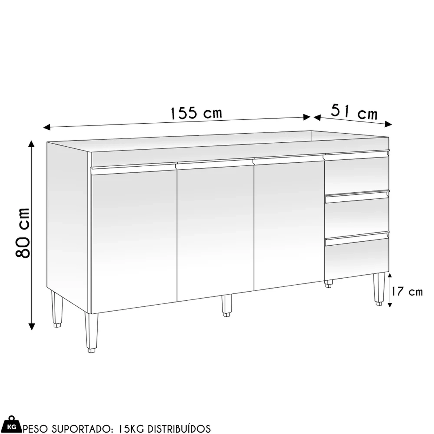O Balcão Gabinete é uma peça muito importante na cozinha, e ele possui estrutura em MDP e acabamento em pintura UV, ou seja, é uma ótima alternativa para os fãs de durabilidade e resistência. Além disso, ele também apresenta 2 portas convencionais com dobradiças metálicas e 3 gavetas com corrediças metálicas, que garantem o deslize suave, os puxadores são em perfil de alumínio para mais durabilidade e amplo espaço interno para guardar seus utensílios, te auxiliar e deixar sua rotina ainda mais dinâmica. Ele não acompanha tampo, então você pode escolher a melhor opção para o seu ambiente deixando-o ainda mais completo! Demais, né?