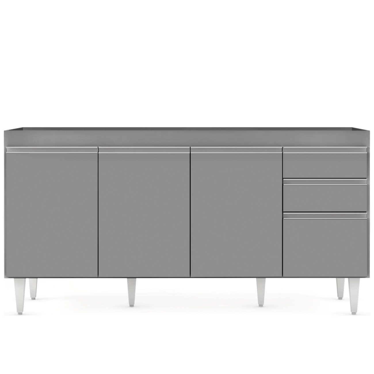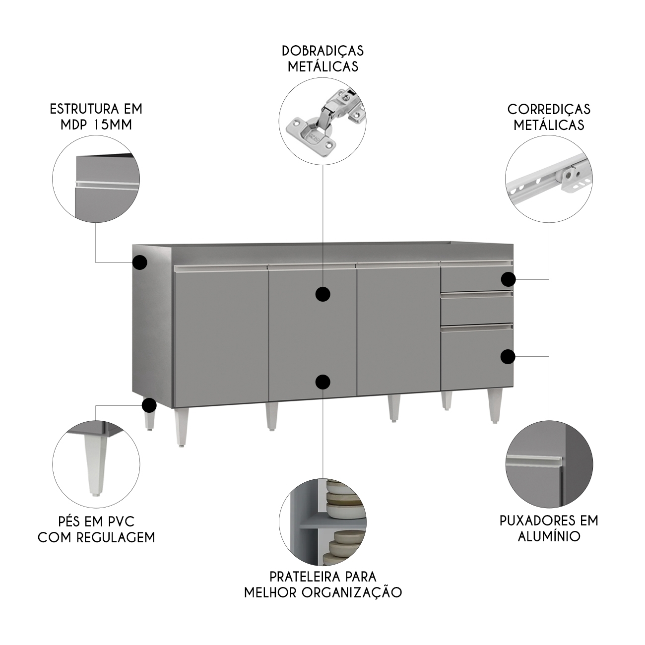 Composto por quatro portas com puxadores em perfil metálico e duas gavetas, oferece excelente espaço interno para guardar utensílios, panelas e talheres, mantendo tudo sempre acessível.