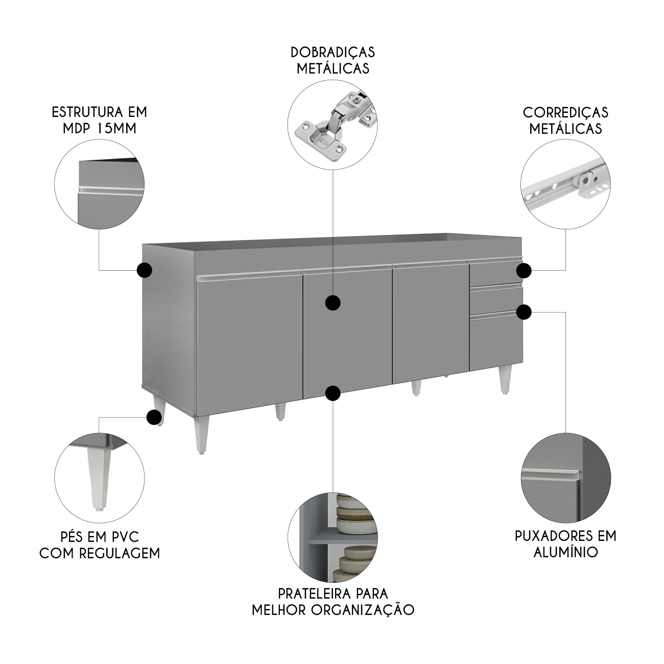 Produzido em MDP com acabamento BP, apresenta alta resistência e fácil limpeza. Possui quatro portas com puxadores em alumínio, duas gavetas laterais com corrediças metálicas e prateleira interna espaçosa.