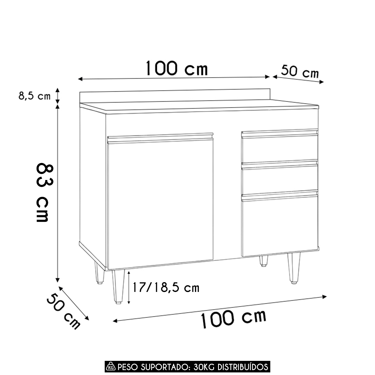 Os pés em PVC oferecem estabilidade e resistência à umidade, assegurando sustentação mesmo em rotinas agitadas. A prateleira interna amplia o armazenamento, perfeita para panelas, louças ou mantimentos de uso frequente.
