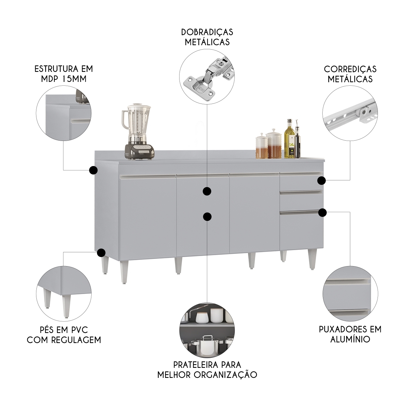 Balcão de Cozinha Para Pia Com Tampo 160cm Arkansas Cinza Claro - Lumil