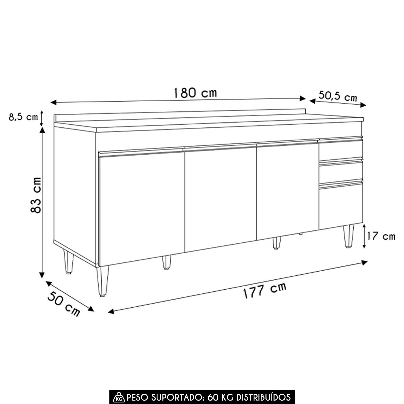 Balcão: 177 x 83 x 50cm.