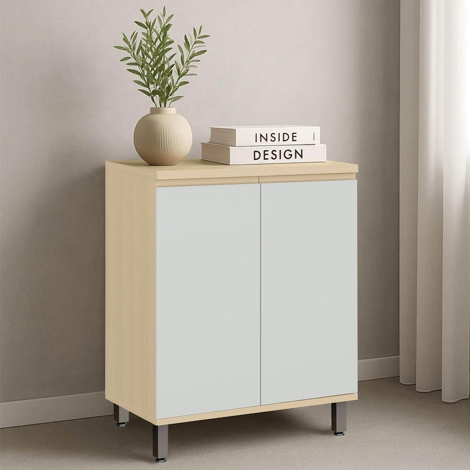 As duas portas possuem dobradiças metálicas com sistema de amortecimento, que asseguram um fechamento suave e silencioso. Os puxadores cava unem praticidade e elegância, equilibrando funcionalidade e design moderno