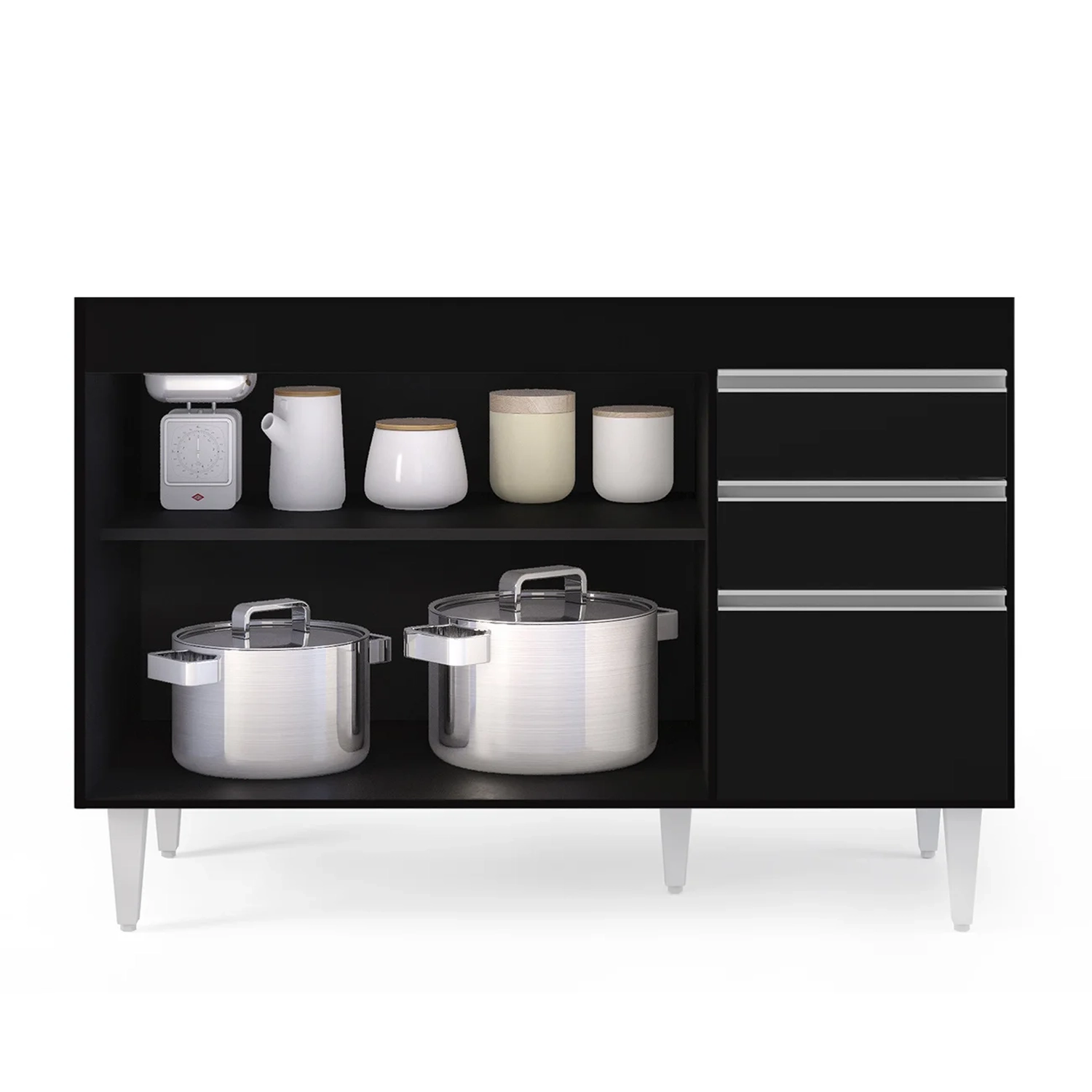 Por ser um cômodo onde praticidade e funcionalidade são conceitos que devem andar juntos, a cozinha muitas vezes é onde mais ficamos em dúvida sobre os complementos, não é? Mas que tal começar pelos itens essenciais como o balcão para pia? Sim, o modelo Michigan Preto é uma ótima alternativa por conter elementos indispensáveis nessa hora, que são as 3 portas com puxador em perfil metálico contendo amplo espaço interno e 2 gavetas para seus talheres! Tudo em MDP com acabamento em pintura BP e pés em PVC para sustentação do móvel!!