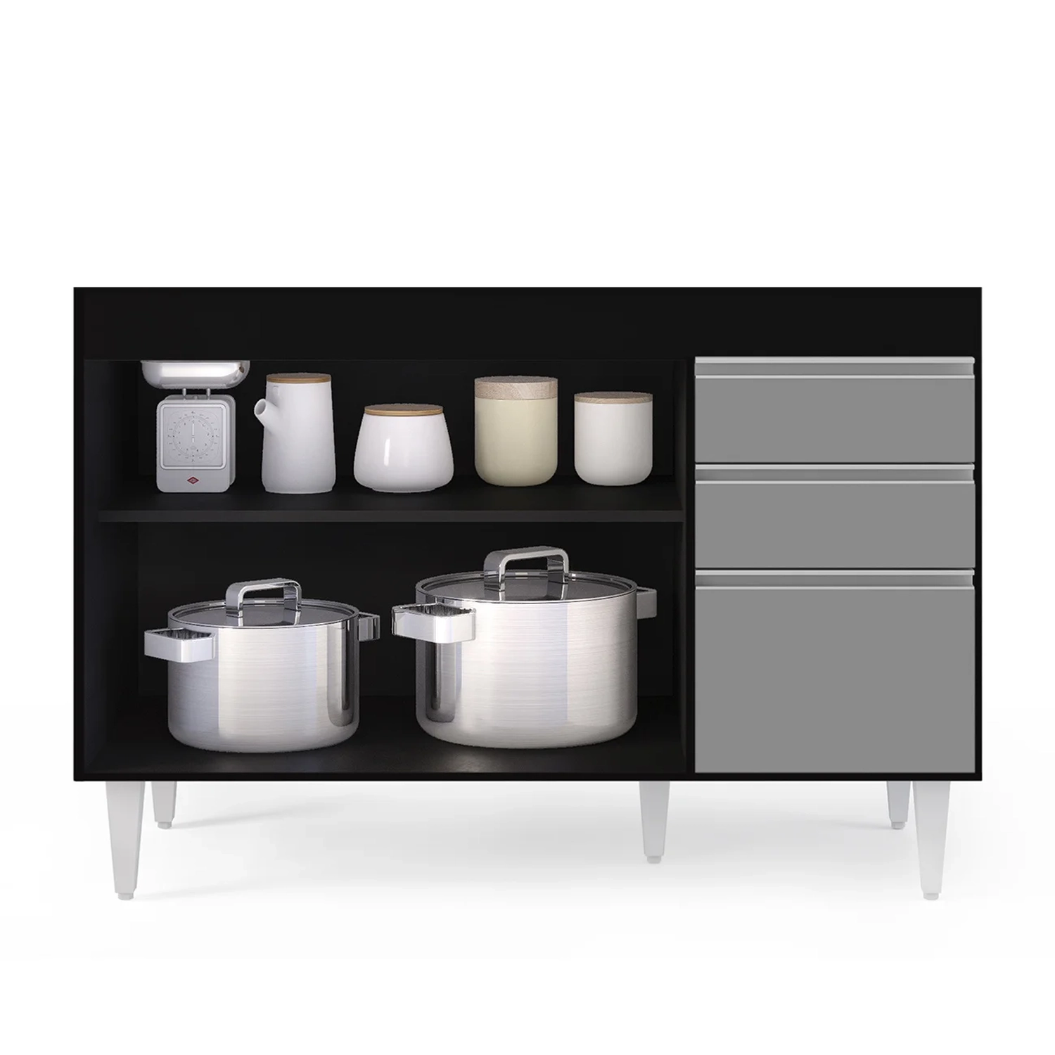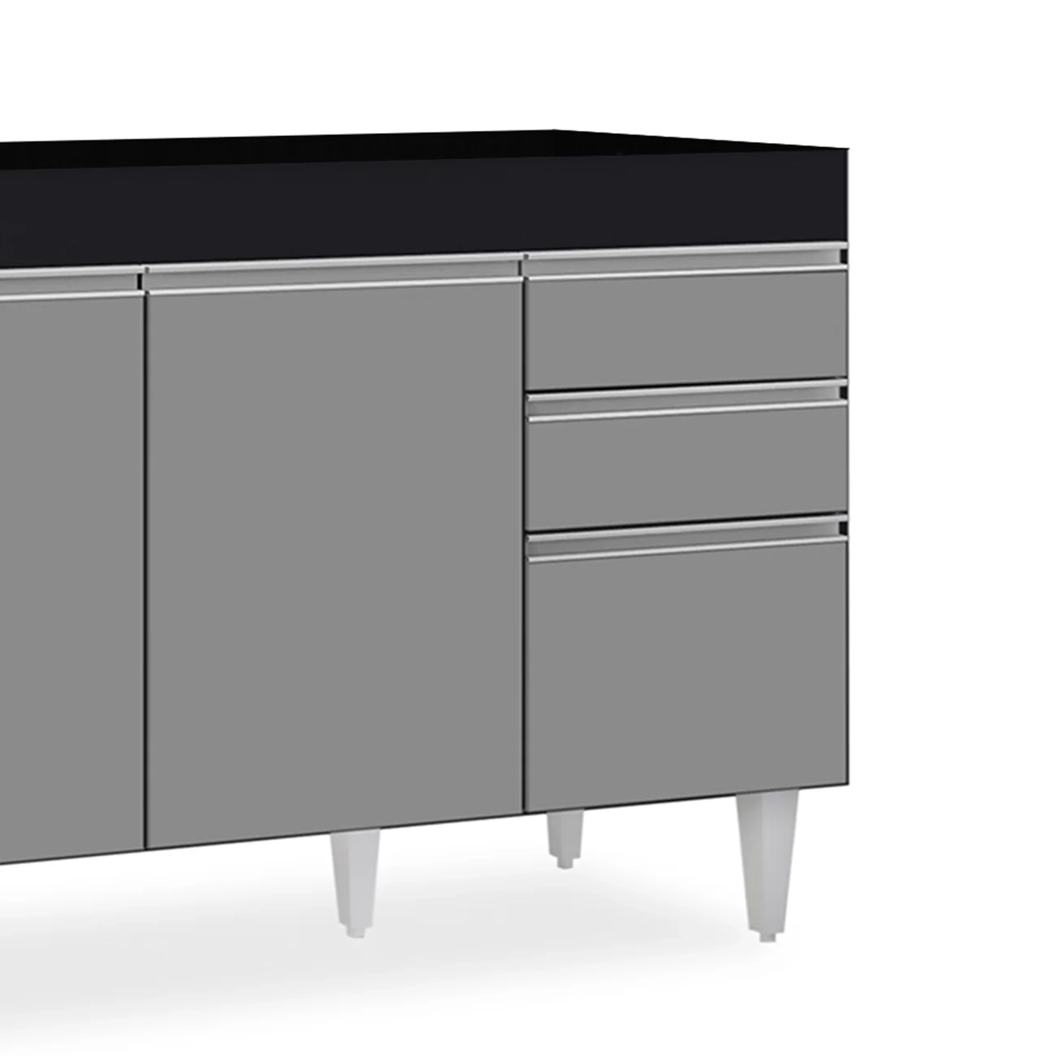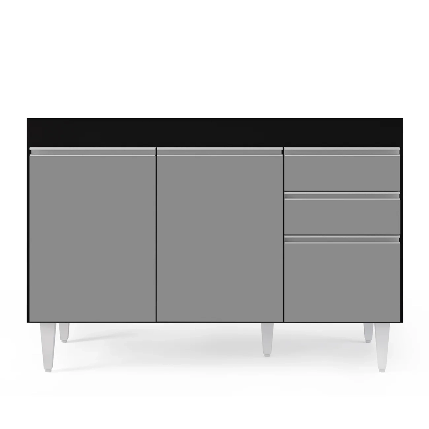 Por ser um cômodo onde praticidade e funcionalidade são conceitos que devem andar juntos, a cozinha muitas vezes é onde mais ficamos em dúvida sobre os complementos, não é? Mas que tal começar pelos itens essenciais como o balcão para pia? Sim, o modelo Michigan Preto/Cinza é uma ótima alternativa por conter elementos indispensáveis nessa hora, que são as 3 portas com puxador em perfil metálico contendo amplo espaço interno e 2 gavetas para seus talheres! Tudo em MDP com acabamento em pintura BP e pés em PVC para sustentação do móvel!!