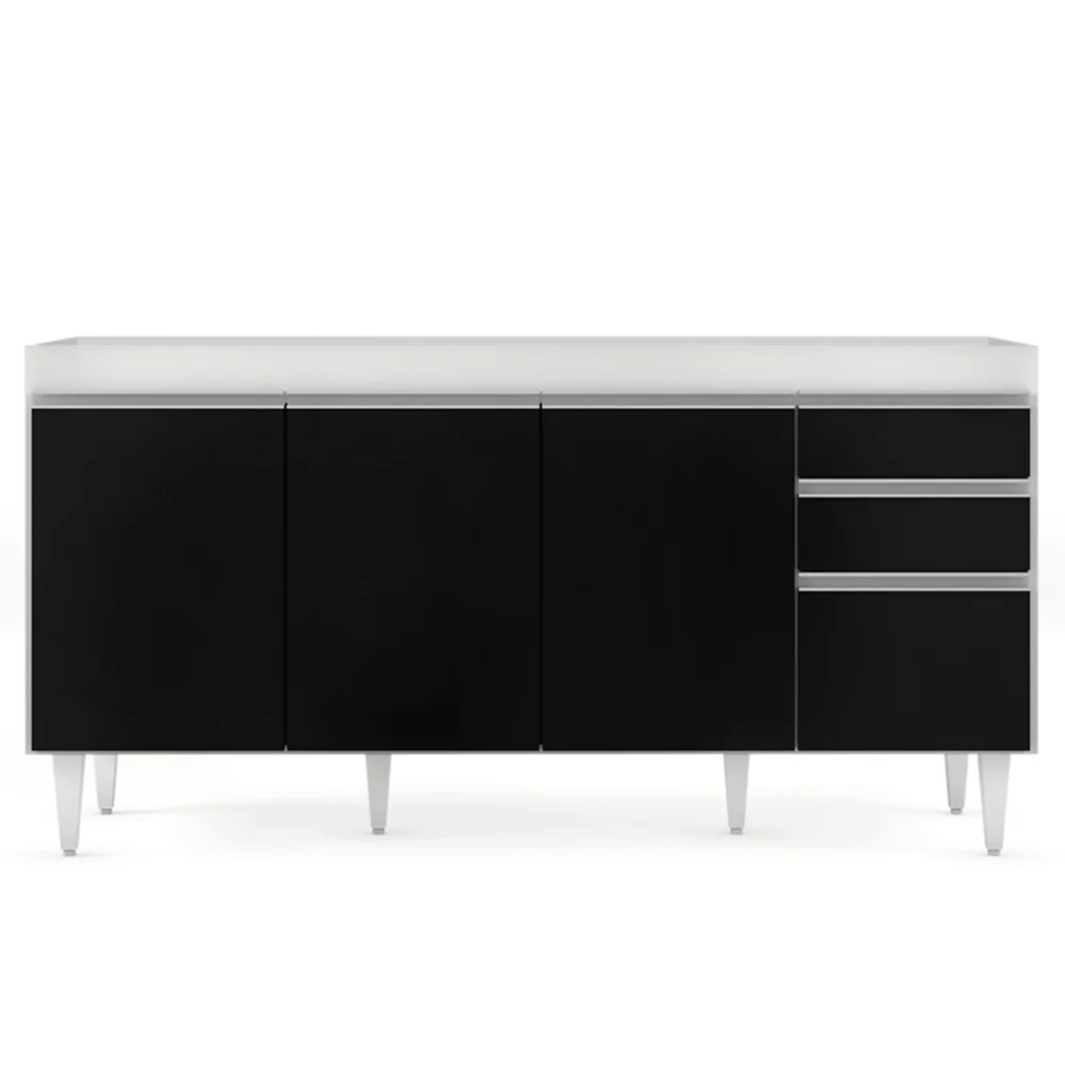 Quem está montando a mobília da casa sabe que esse cômodo às vezes é onde mais ficamos em dúvida sobre os complementos, não é? Mas que tal começar pelos itens essenciais como o balcão para pia? Sim, o modelo Arkansas Branco/Preto da Lumil Móveis é uma ótima alternativa por 4 portas com puxador em perfil metálico contendo amplo espaço interno e 2 gavetas para seus talheres! Ou seja, elementos que fazem toda a diferença no dia a dia. Ah, e tudo em MDP com acabamento em pintura BP e pés em PVC para sustentação do móvel!!
