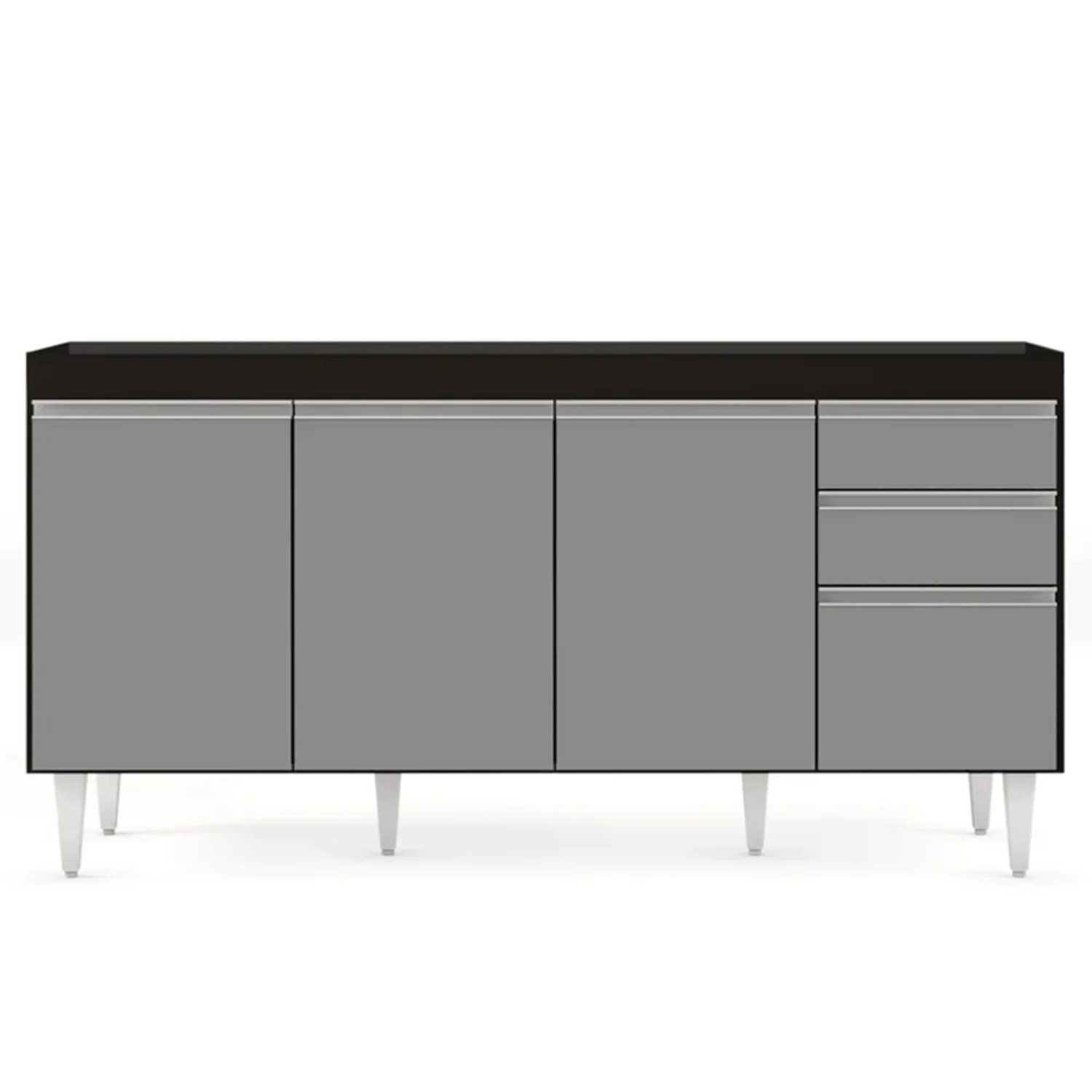 Quem está montando a mobília da casa sabe que esse cômodo às vezes é onde mais ficamos em dúvida sobre os complementos, não é? Mas que tal começar pelos itens essenciais como o balcão para pia? Sim, o modelo Arkansas Preto/Cinza da Lumil Móveis é uma ótima alternativa por 4 portas com puxador em perfil metálico contendo amplo espaço interno e 2 gavetas para seus talheres! Ou seja, elementos que fazem toda a diferença no dia a dia. Ah, e tudo em MDP com acabamento em pintura BP e pés em PVC para sustentação do móvel!!