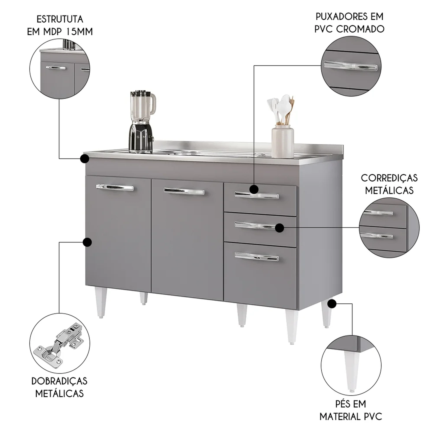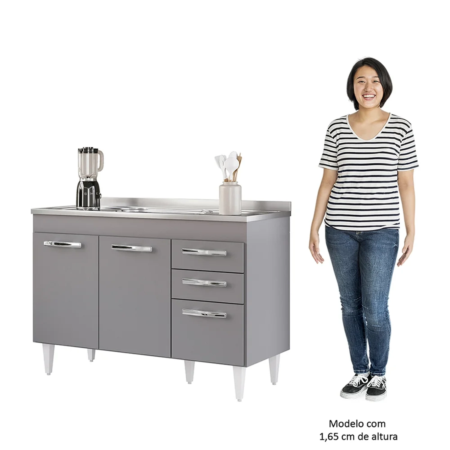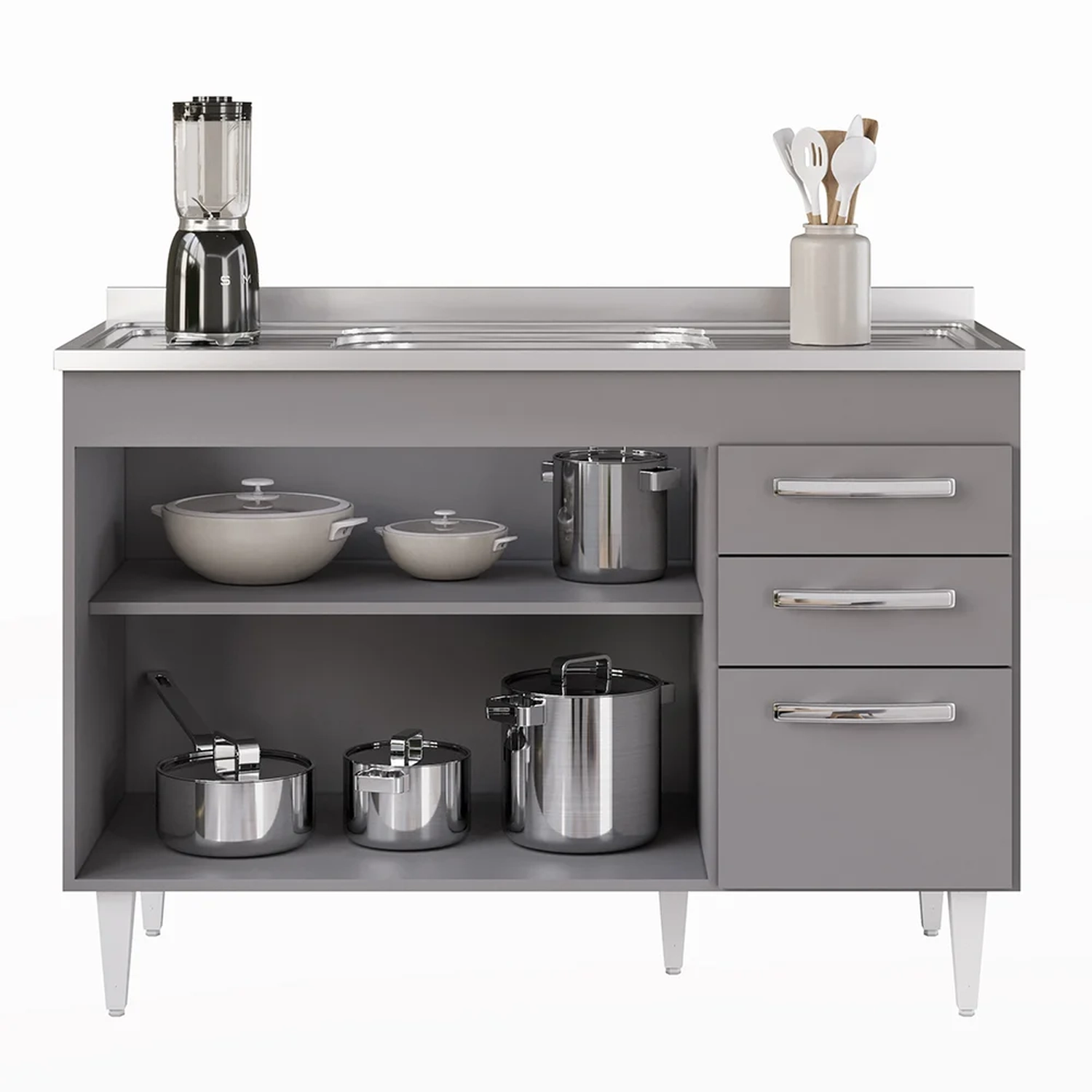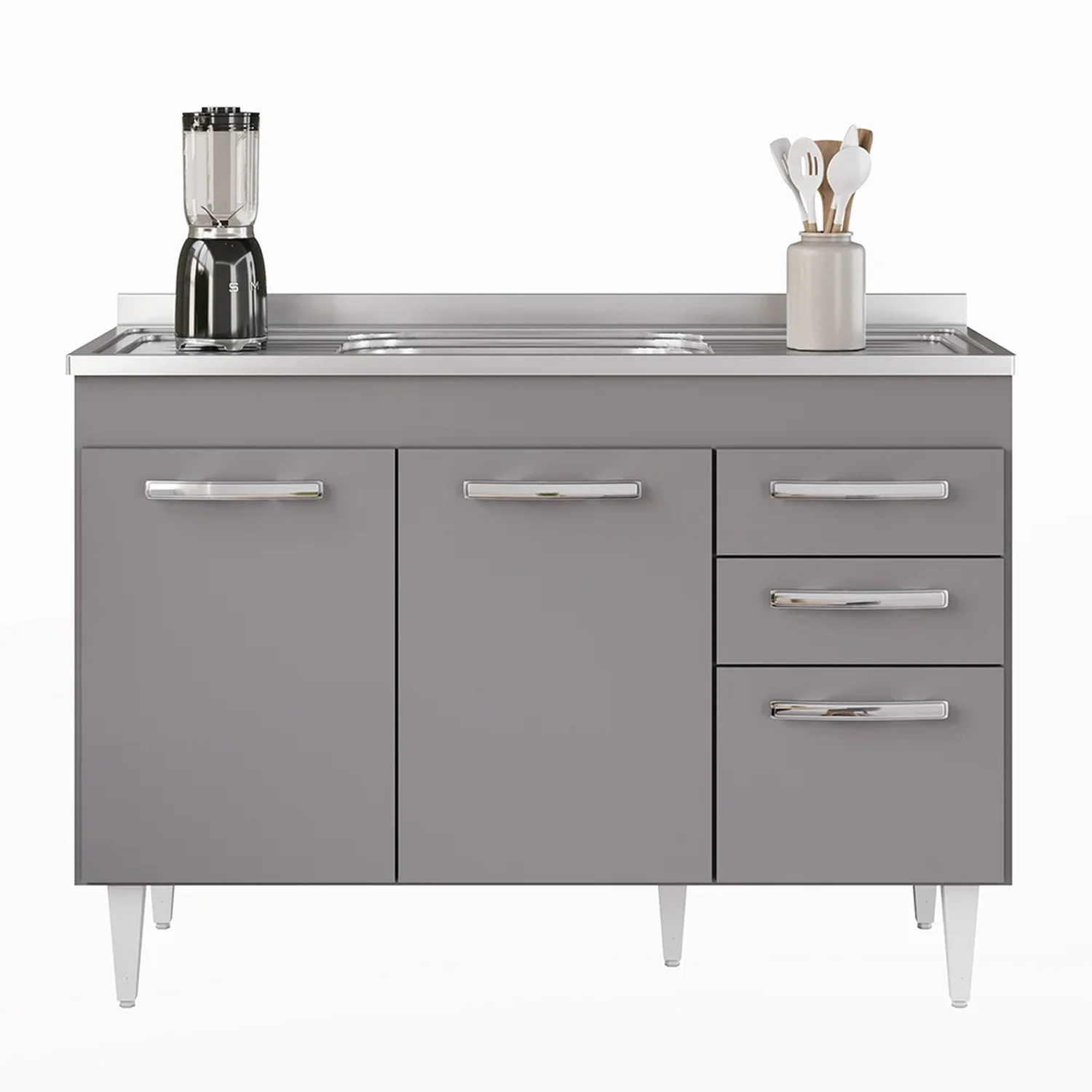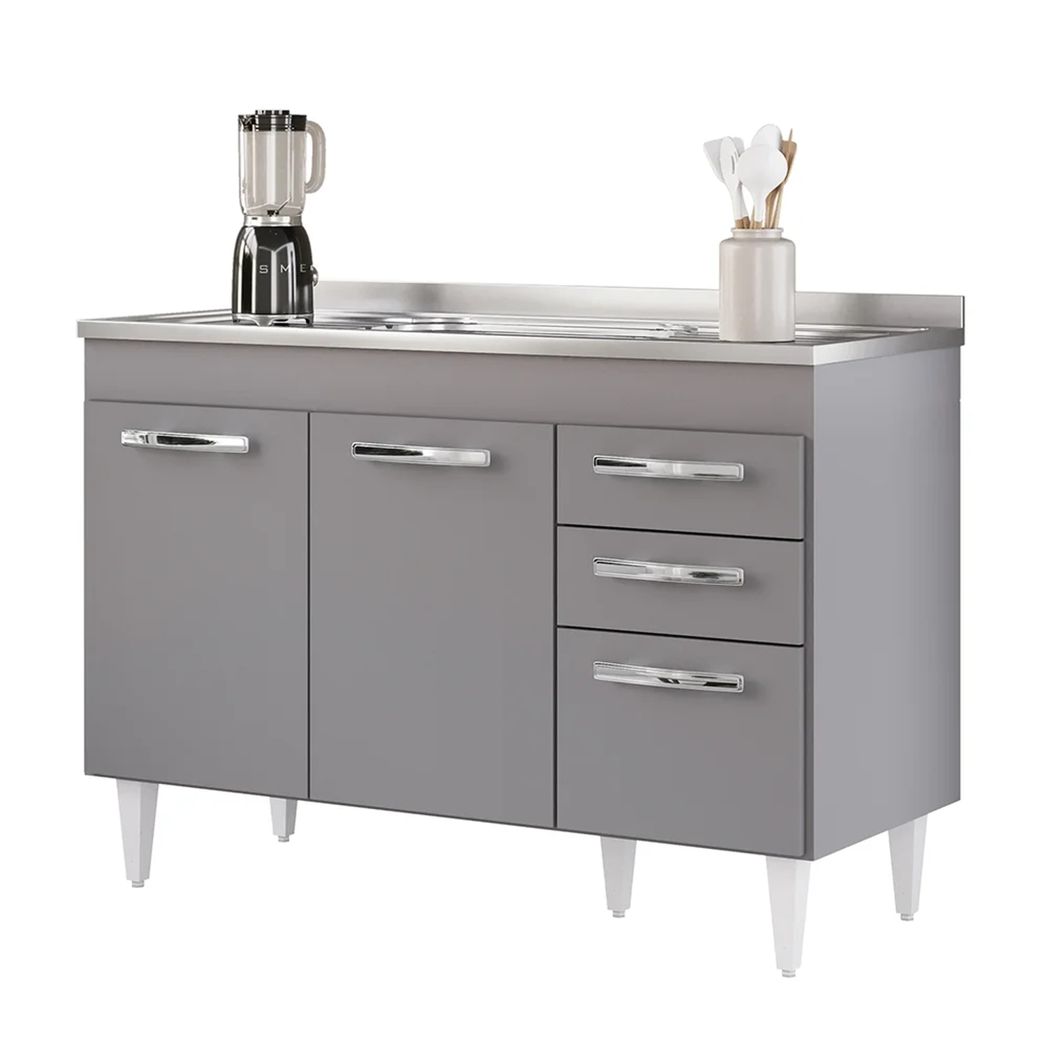 Na hora de escolher o móvel que vai compor o ambiente é preciso estar atento, afinal com cozinhas cada vez menores, deve ser compacto e funcional assim como o Balcão Gabinete com Pia Inox 120cm 3 Portas 2 Gavetas Suécia Cinza, da Lumil.
