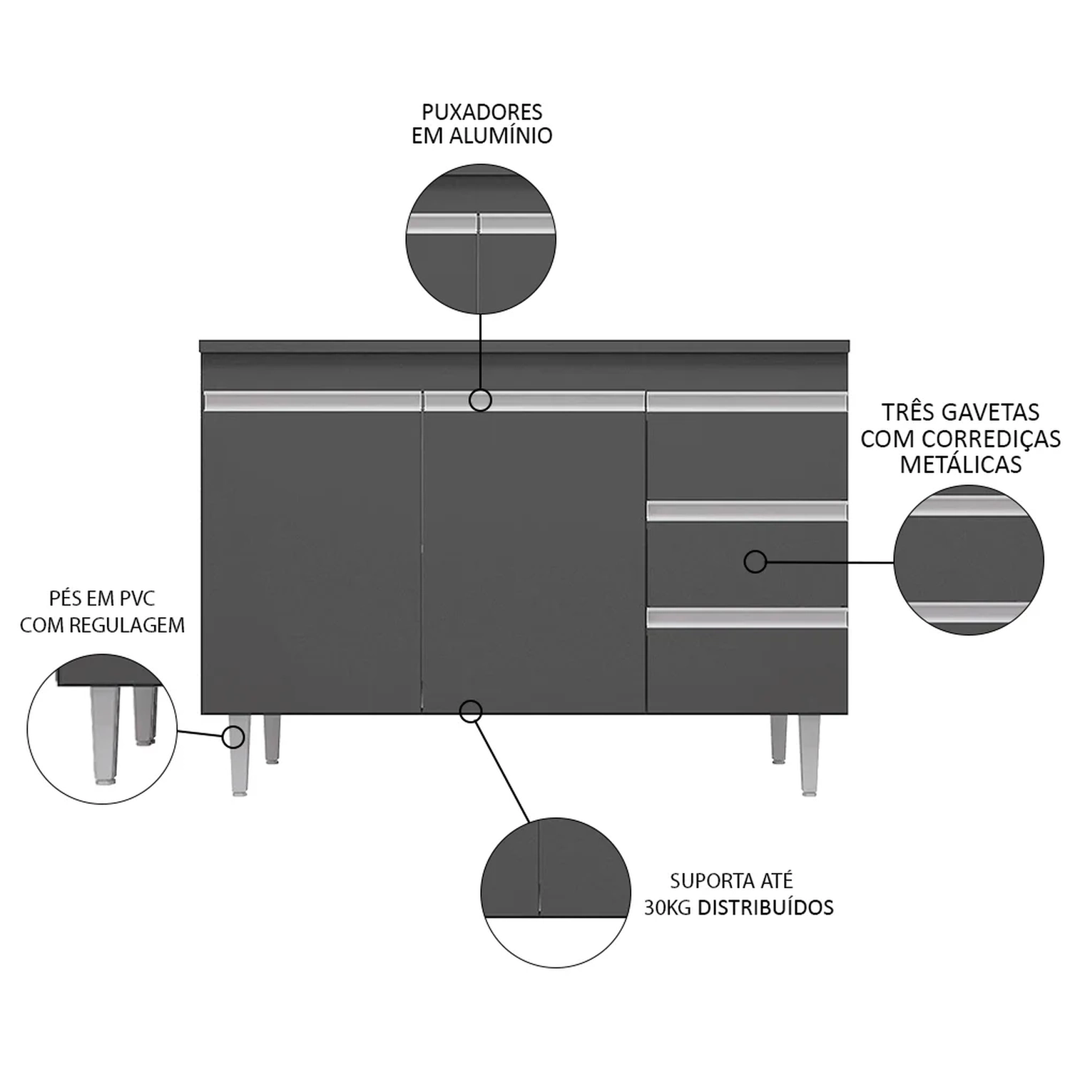 Esse Balcão é feito de material MDP de alta qualidade e fácil de limpar, ele possui puxadores em alumínio, que dão um toque de sofisticação, elegância e mais durabilidade ao móvel. O Balcão Gabinete Para Pia tem uma prateleira interna, duas portas e três gavetas, ideais para guardar utensílios, panelas, talheres e outros objetos. Excelente pra você que tem pouco espaço e precisa de algo compacto, porém com qualidade, o móvel que você precisa para deixar sua Cozinha mais bonita e organizada.