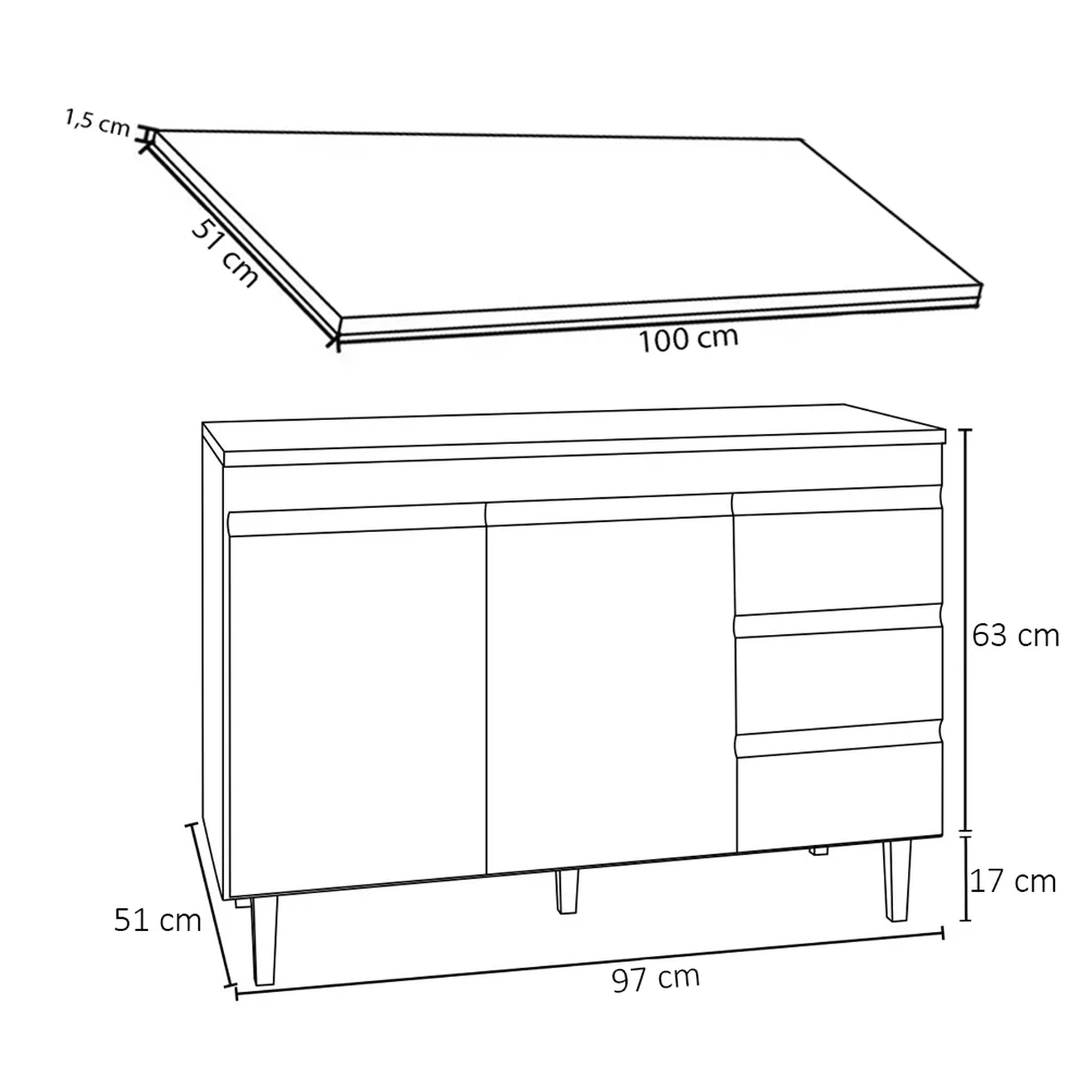 Balcão: 97 cm x 80 cm x 51 cm.