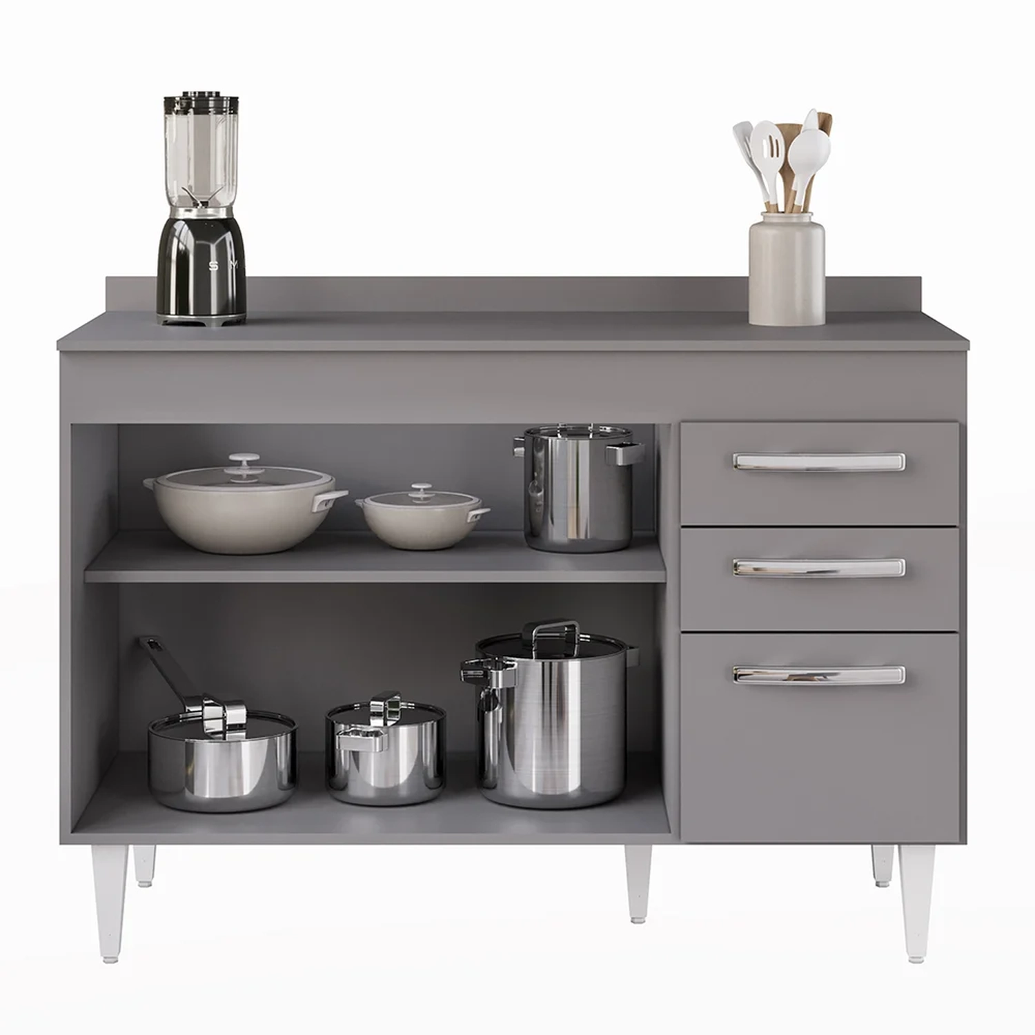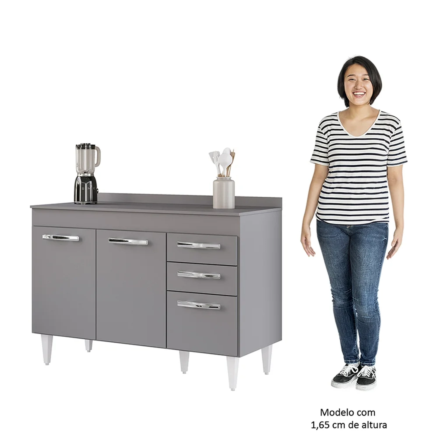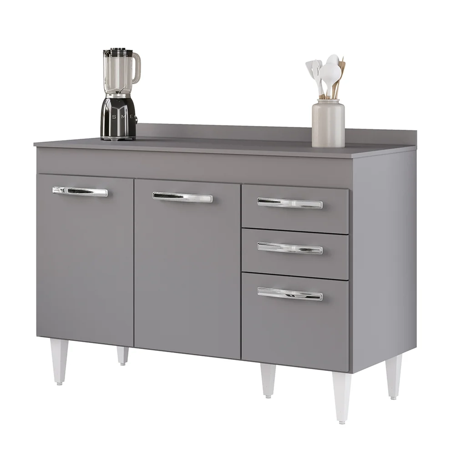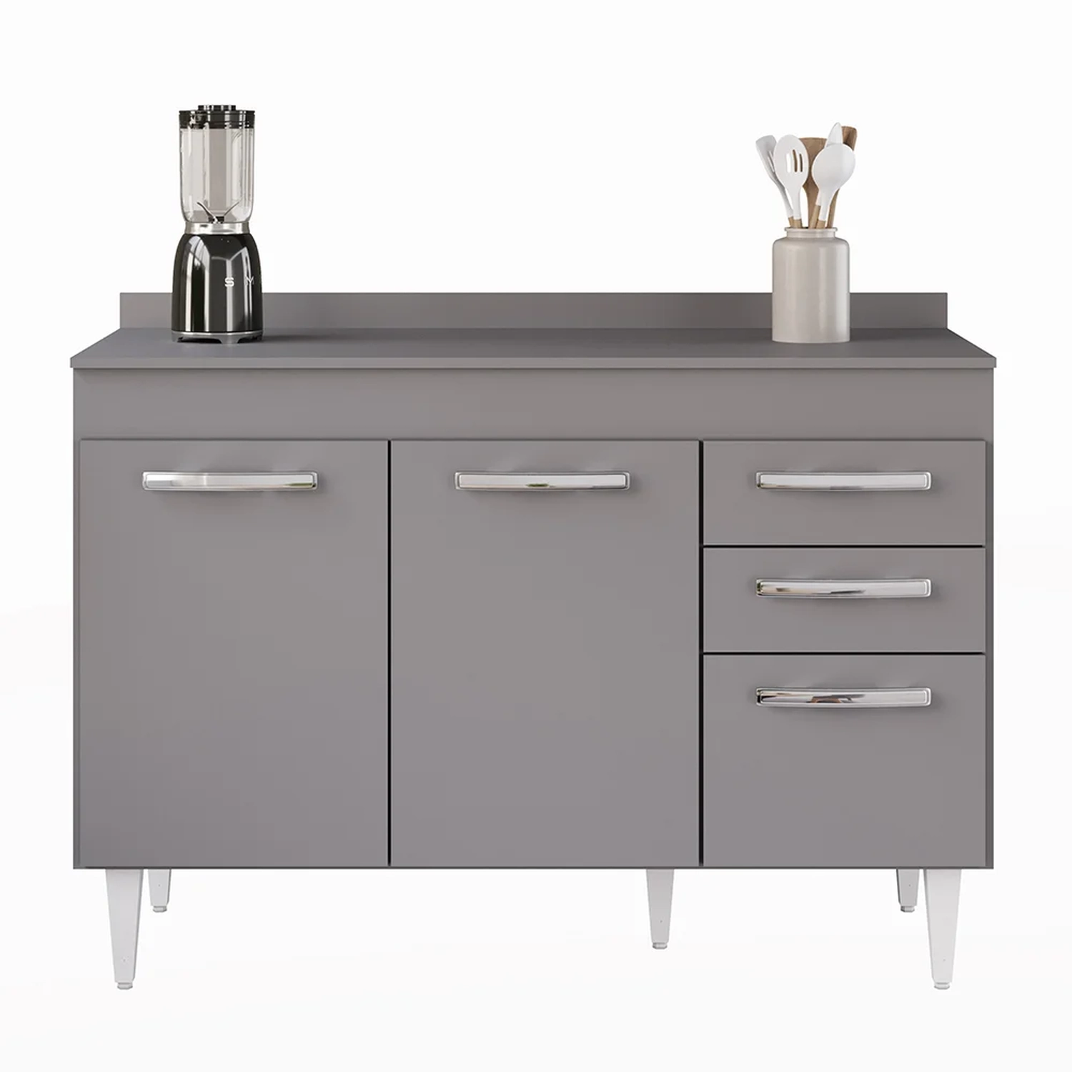 Na hora de escolher o móvel que vai compor o ambiente é preciso estar atento, afinal com cozinhas cada vez menores, deve ser compacto e funcional assim como o Balcão Gabinete Para Pia 120cm 3 Portas com Tampo Suécia Cinza, da Lumil.