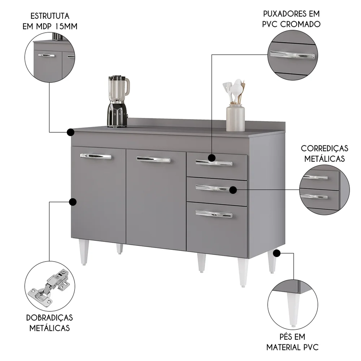 Esse Balcão Para Pia conta com 3 portas e 2 gavetas conta com uma prateleira interna excelente para organizar seus potes ou mantimentos. Os puxadores são em PVC cromado, resistentes e fáceis de limpar, as dobradiças e corrediças são metálicas, garantido ainda mais qualidade. Além disso, a estrutura do Balcão Gabinete é feito em MDP com revestimento em BP, o que resulta em um acabamento resistente e duradouro. Ah, e os pés reguláveis de PVC facilitam o ajuste do móvel de acordo com o nivelamento do piso. Ele acompanha tampo em MDP 15mm de 120cm, ideal para apoiar utensílios e auxiliar no dia a dia aproveitando ainda mais seu ambiente!