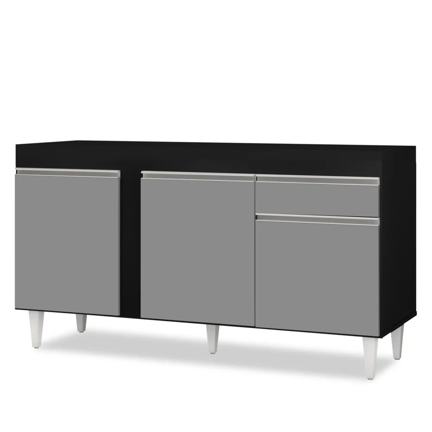 Escolher a dedo os móveis desse cômodo não é uma tarefa fácil, ainda mais por ser onde conta com uma dose extra de detalhes extremamente necessários na hora de preparar as refeições ou simplesmente usá-la no dia a dia. Para isso, um balcão para pia é uma das peças principais! O modelo Balcão Dakota Preto/Cinza não acompanha tampo, possui 3 portas de puxadores em perfil alumínio, 1 prateleira interna e ainda conta com 1 gaveta oferecendo espaço e organização. Além disso, pés em PVC e estrutura em MDP com acabamento em pintura BP fazem dele um móvel imperdível para sua casa!!