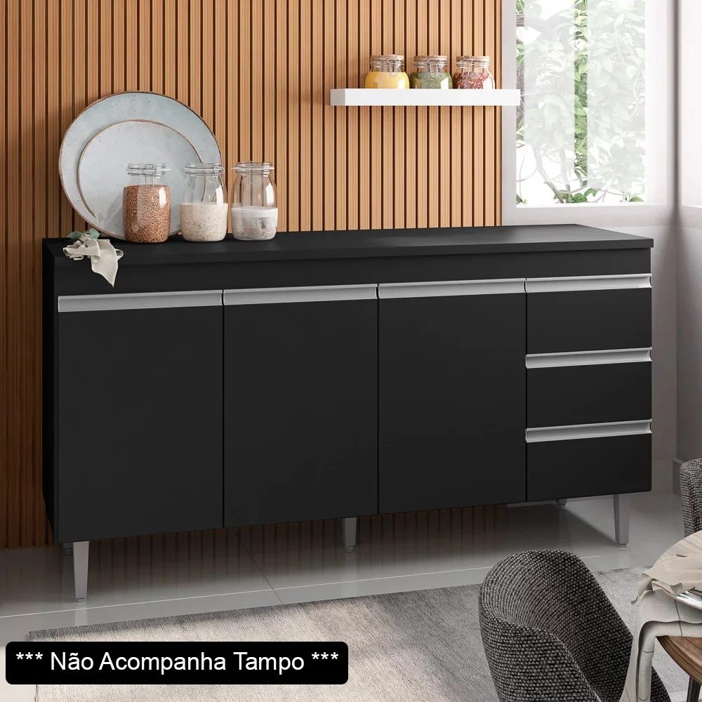 O Balcão é uma peça muito importante na cozinha, e ele possui estrutura em MDP e acabamento em pintura UV, ou seja, é uma ótima alternativa para os fãs de durabilidade e resistência. Além disso, ele também apresenta 3 portas convencionais e 3 gavetas de deslize suave e amplo espaço interno para guardar seus utensílios, te auxiliar e deixar sua rotina ainda mais dinâmica. Tudo de bom, né?