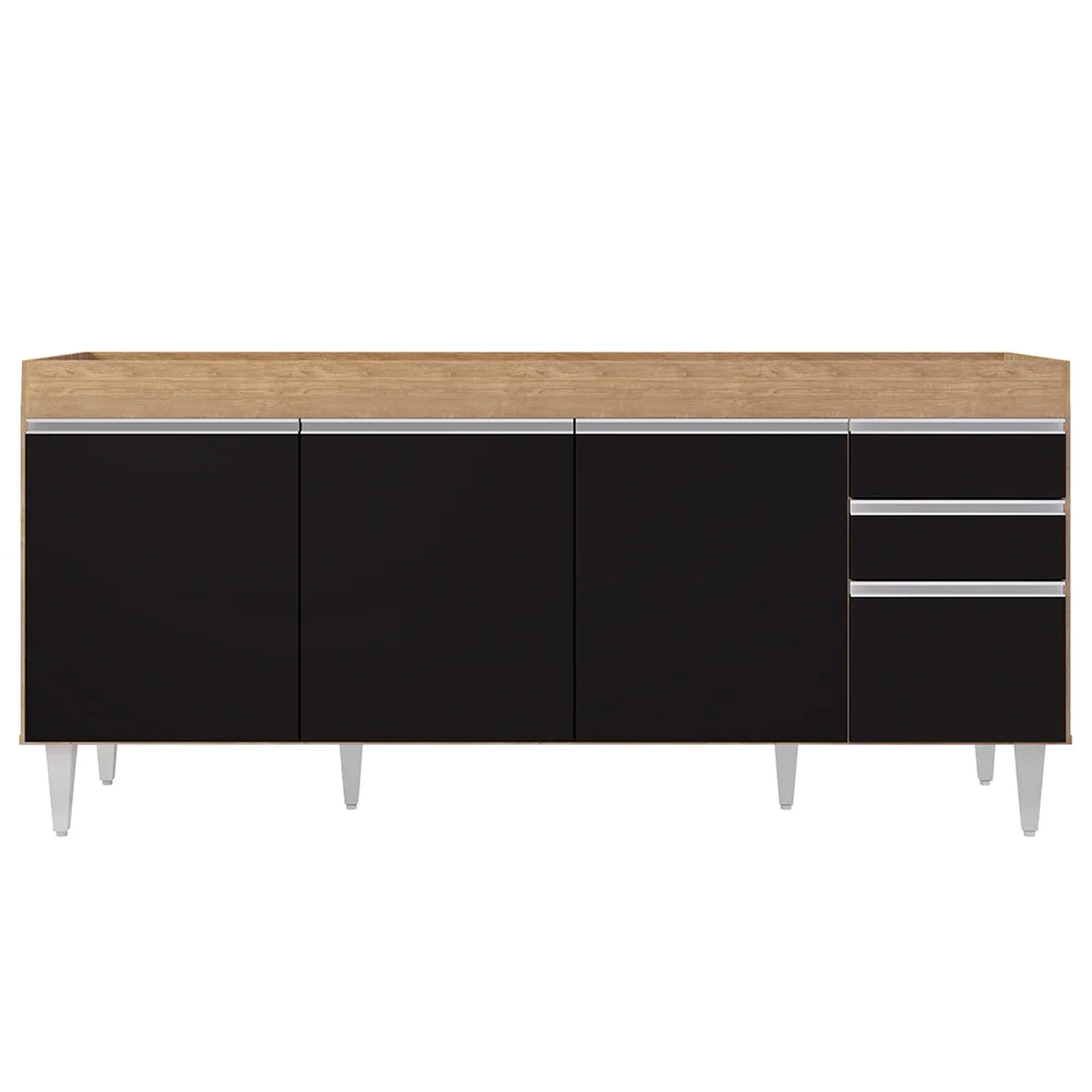 Fabricado em MDP com acabamento em pintura UV, o Balcão Gabinete Dallas Castanho/Preto é uma excelente opção para quem tem uma cozinha com amplo espaço disponível para louça, panelas e demais acessórios utilizados neste ambiente que podem ser aproveitados da melhor maneira. Além da estrutura, também conta com pés reguláveis em PVC, 4 portas convencionais com puxador em alumínio embutido e 1 prateleira interna. Além é claro, de 2 gavetas na lateral também com puxadores embutidos para facilitar o manuseio e com corrediças metálicas e espaço ótimo para guardar seus talheres e utensílios. Ah, não possui tampo, mas pode formar conjunto com tampo ou pia vendidos separadamente.