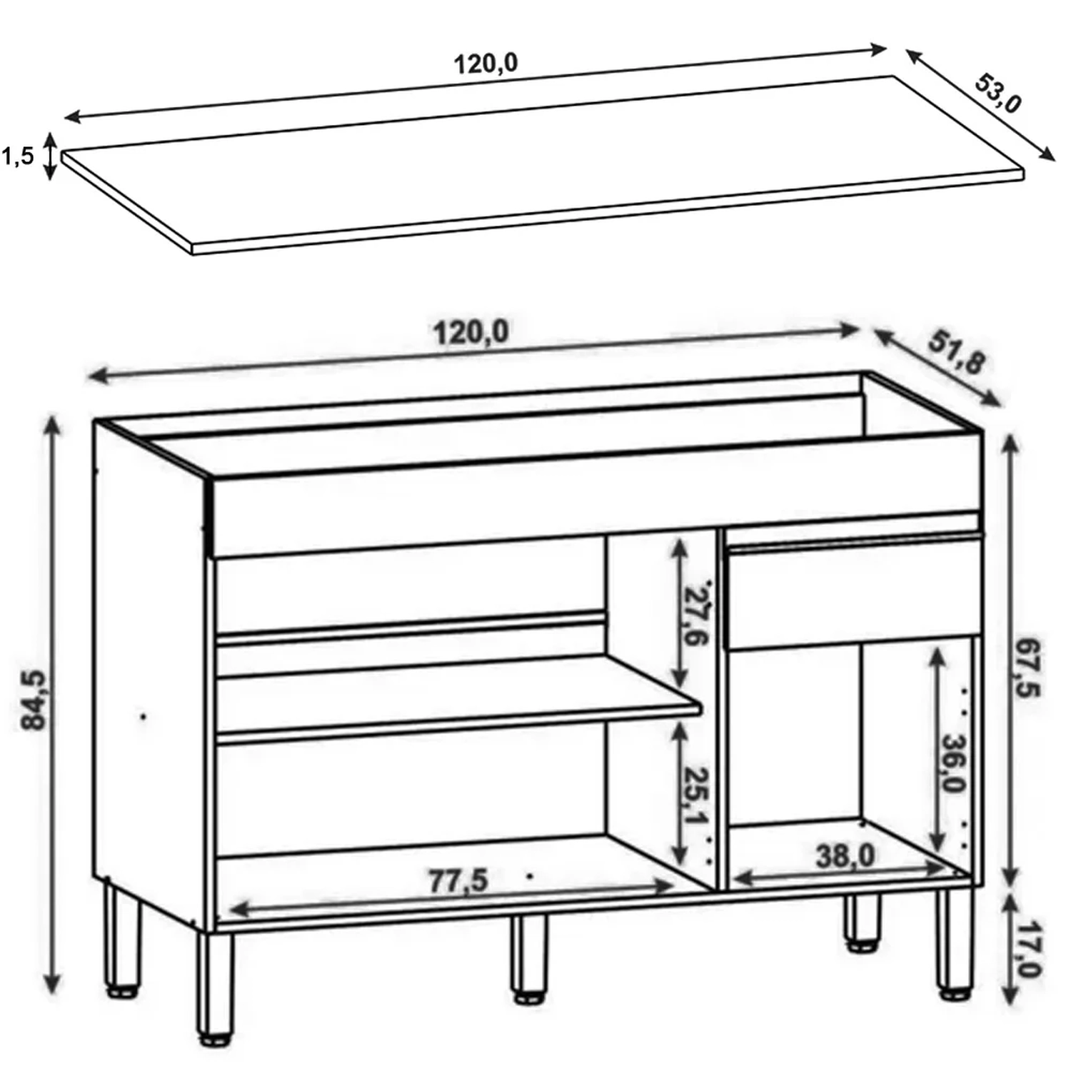 Balcão: 120 cm x 84,5 cm x 51,8 cm.