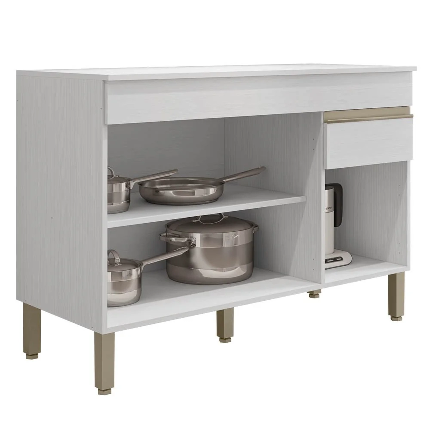 O Balcão Gabinete acompanha tampo de 120cm para apoio de utensílios ou eletroportáteis, uma gaveta e três portas, ele permite guardar utensílios e mantimentos de forma organizada e aproveitar o espaço. O Balcão Para Pia tem um design moderno e pode combinar com diferentes estilos de decoração, além de lindo ele é feito de material resistente, portas com dobradiças 100% metálicas que garante mais segurança e qualidade ao produto, puxadores em perfil alumínio com pintura epóxi e prateleira interna que permitem melhor organização dos itens, aplicação de textura sensível ao toque e acabamento de pintura com secagem em luzes UV.