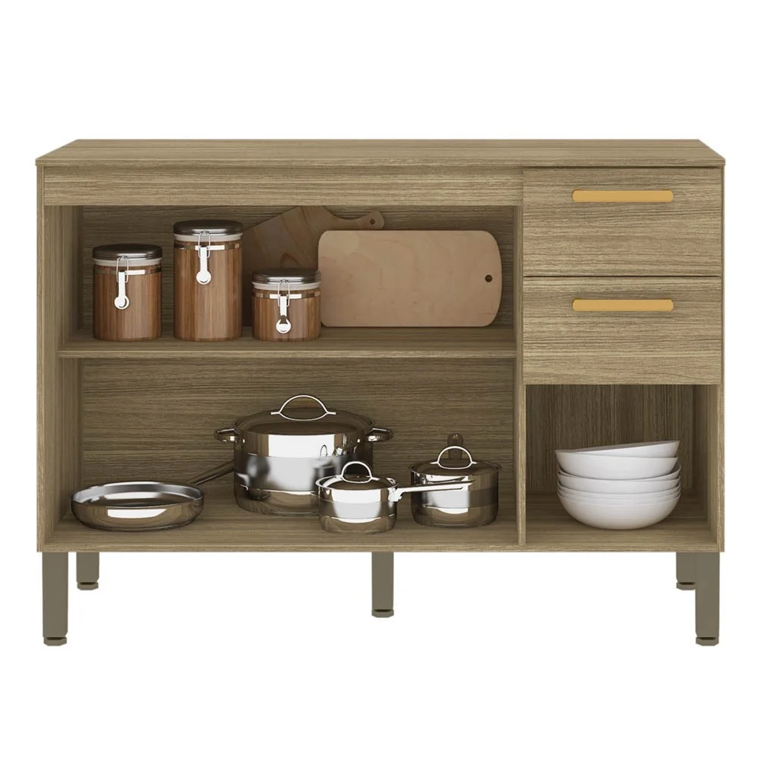 A Cozinha é um dos principais cômodos da casa, afinal é onde preparamos as refeições e nos reunimos para compartilhá-las, por isso, ter uma Balcão de Cozinha que seja bonito e resistente é super importante. Pensando nisso, apresentamos o Balcão Gabinete com Tampo, o seu design clean combina com vários estilos de decoração e sua estrutura é produzida em MDP 12 e 15mm e acabamento com pintura UV. Além disso, conta com 3 portas com dobradiças 100% metálicas e 2 gavetas com corrediças telescópicas que deslizam suavemente. Ah! Ainda acompanha um Tampo para você dispor dos utensílios que mais utiliza para facilitar o seu dia a dia.
