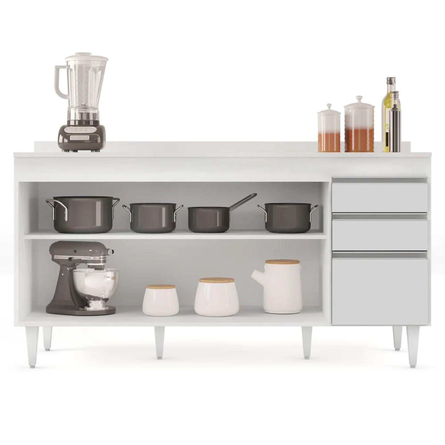 Pensando especialmente nesses momentos, a Lumil desenvolveu o Balcão Arkansas que conta com 4 portas, 2 gavetas com corrediças metálicas, 1 prateleira e 6 pés reguláveis. Esse balcão de cozinha foi projetado para otimizar espaço, nele você pode guardar tudo o que precisa como talheres, panelas, potes, eletrodomésticos entre outros. Além disso, acompanha um Tampo, ideal para dispor os itens que mais utiliza, deixando tudo a mão. Todos os produtos são fabricados em MDP com revestimento BP e acabamento com fita de borda em papel, agregando beleza, durabilidade e resistência.