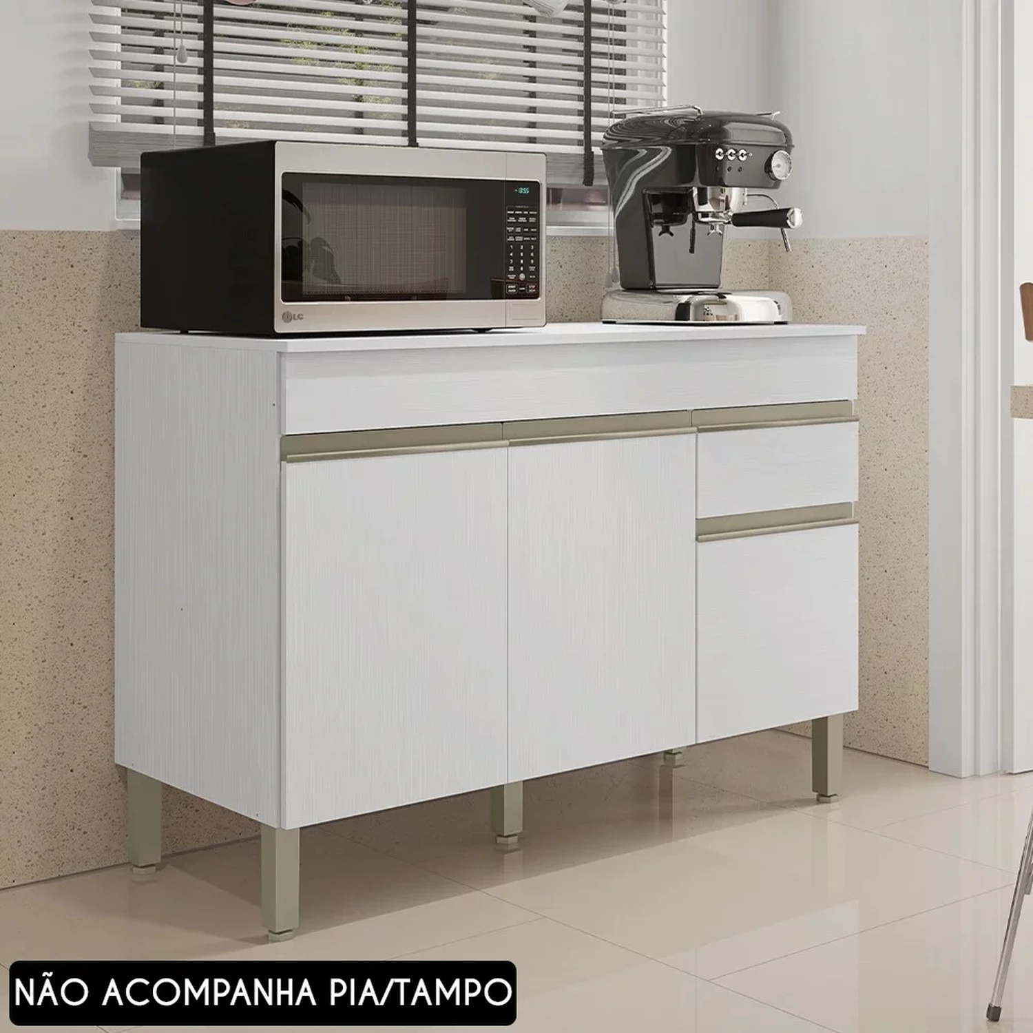O Balcão Gabinete possui espaço para pia ou tampo de 150cm, uma gaveta e três portas, ele permite guardar utensílios e mantimentos de forma organizada e aproveitar o espaço. O Balcão Para Pia, além de lindo ele é feito de material resistente, portas com dobradiças 100% metálicas que garante mais segurança e qualidade ao produto, tem um design moderno e pode combinar com diferentes estilos de decoração, puxadores em perfil alumínio com pintura epóxi e prateleira interna que permitem melhor organização dos itens, aplicação de textura sensível ao toque e acabamento de pintura com secagem em luzes UV.