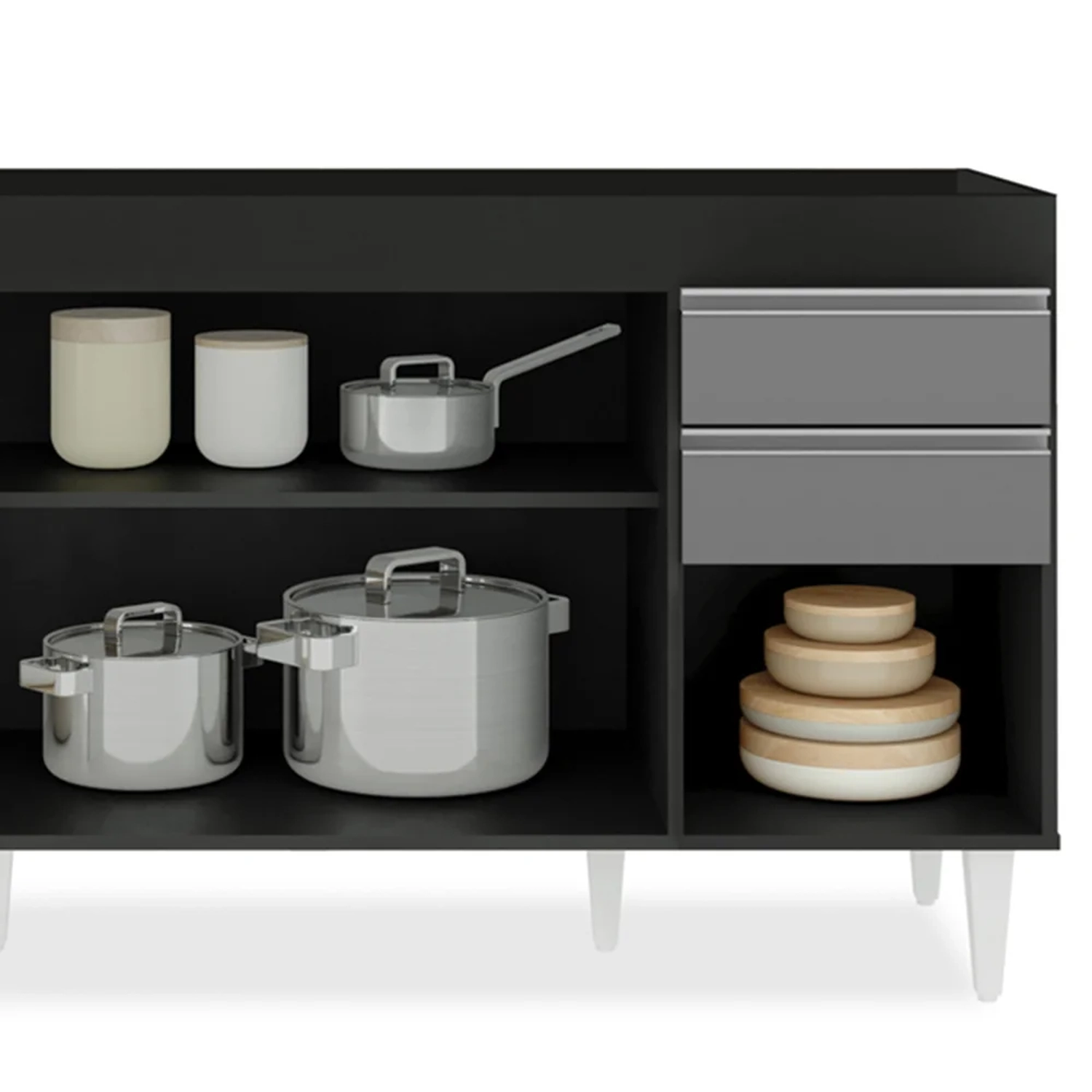 Mas as qualidades desse Gabinete para Pia não param por aqui, com um amplo espaço interno para não deixar de lado a organização, já que conta com uma prateleira interna e duas gavetas para você dispor panelas, louças e os utensílios de cozinha que precisam estar sempre ao alcance das mãos. Quanto ao acabamento e estrutura do Balcão para Pia também não há o que questionar, porque é fabricado em MDP 15mm com acabamento BP e os puxadores em alumínio modelo cava dão um toque de modernidade, deixando o ambiente muito mais bonito, até porque o coração da casa merece esse cuidado.