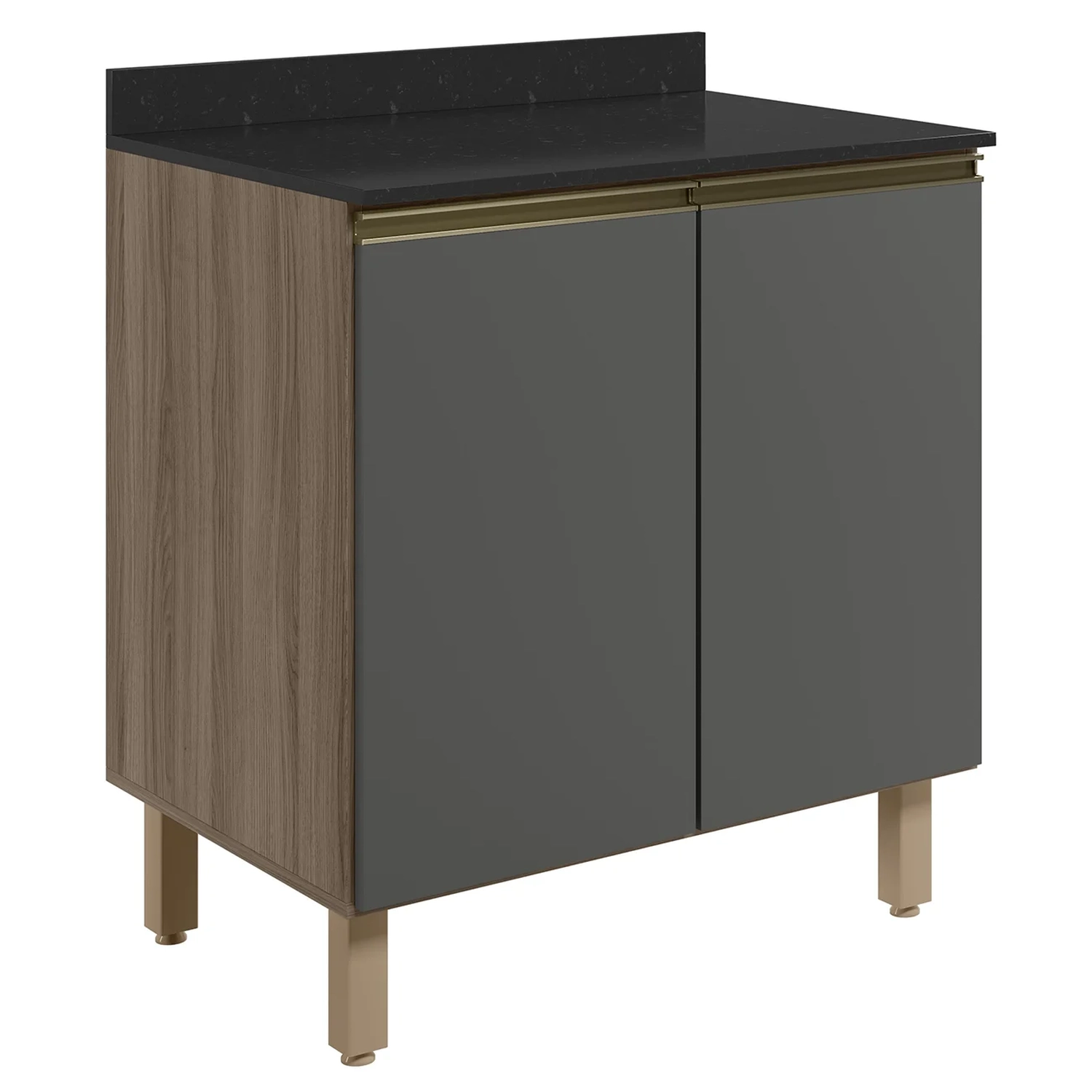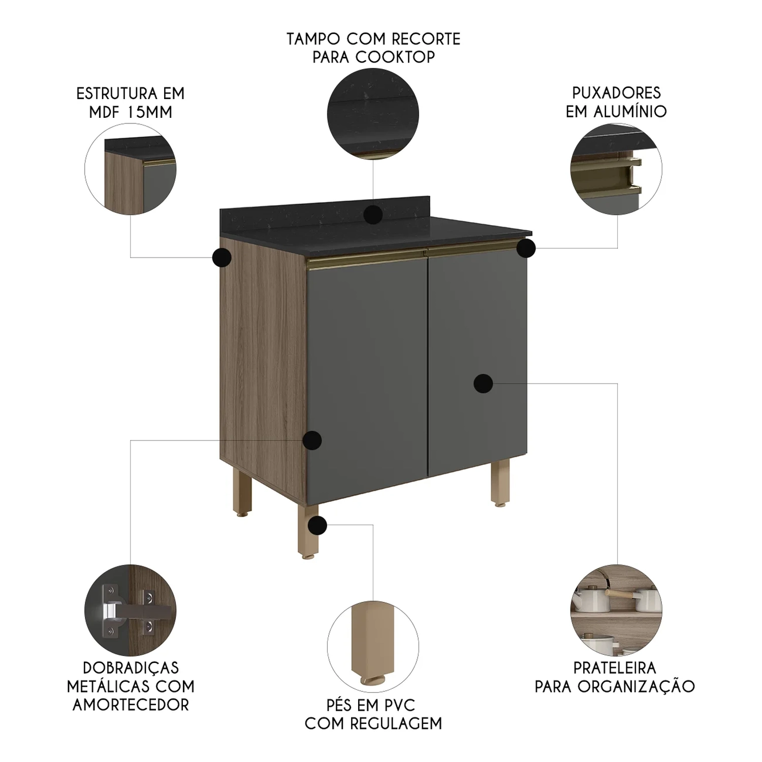 Um Balcão para Cooktop Com Tampo 80cm Maly N03 Carvalho/Grafite, da Mpozenato em MDF de 15mm com acabamento em pintura UV representa uma opção elegante e prática para uma Cozinha Moderna.