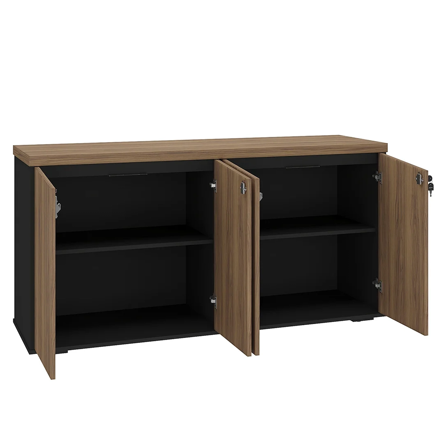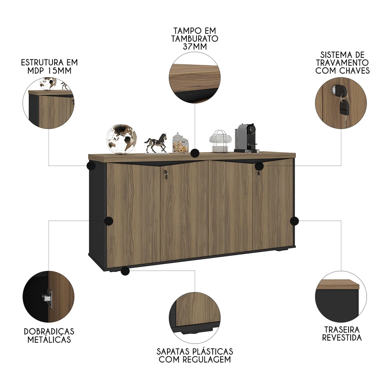 Com um design contemporâneo e sofisticado, esse balcão 4 portas não só embeleza o espaço corporativo, como também oferece amplo armazenamento para todos os itens indispensáveis. As quatro portas garantem fácil acesso a livros, documentos e materiais do dia a dia, enquanto o sistema de travamento com chaves assegura a proteção dos seus pertences e tudo com a organização que você precisa. Além disso, o tampo em Tamburato pode ser aproveitado tanto para expor objetos decorativos, como também reservar um espaço para o cantinho do café. Afinal, todos merecem uma pausa.