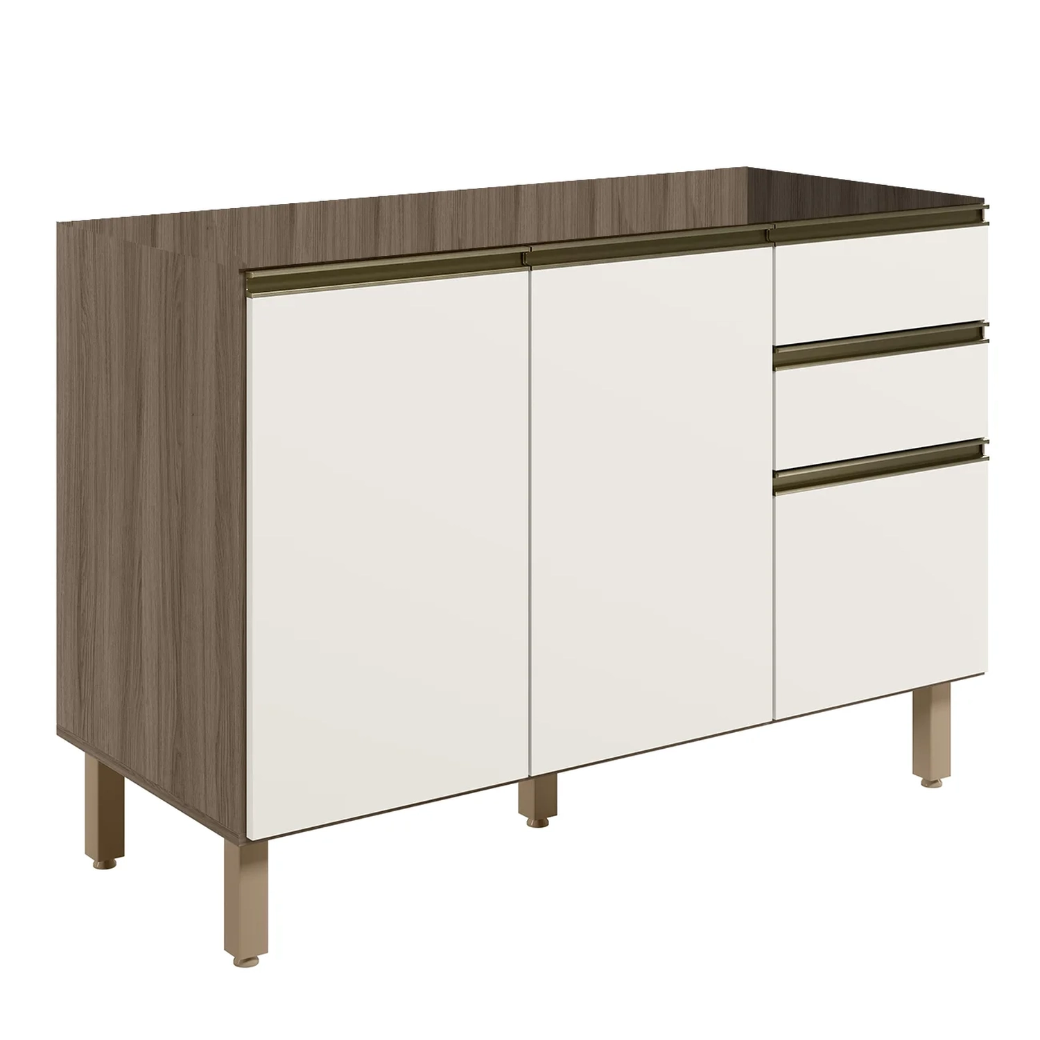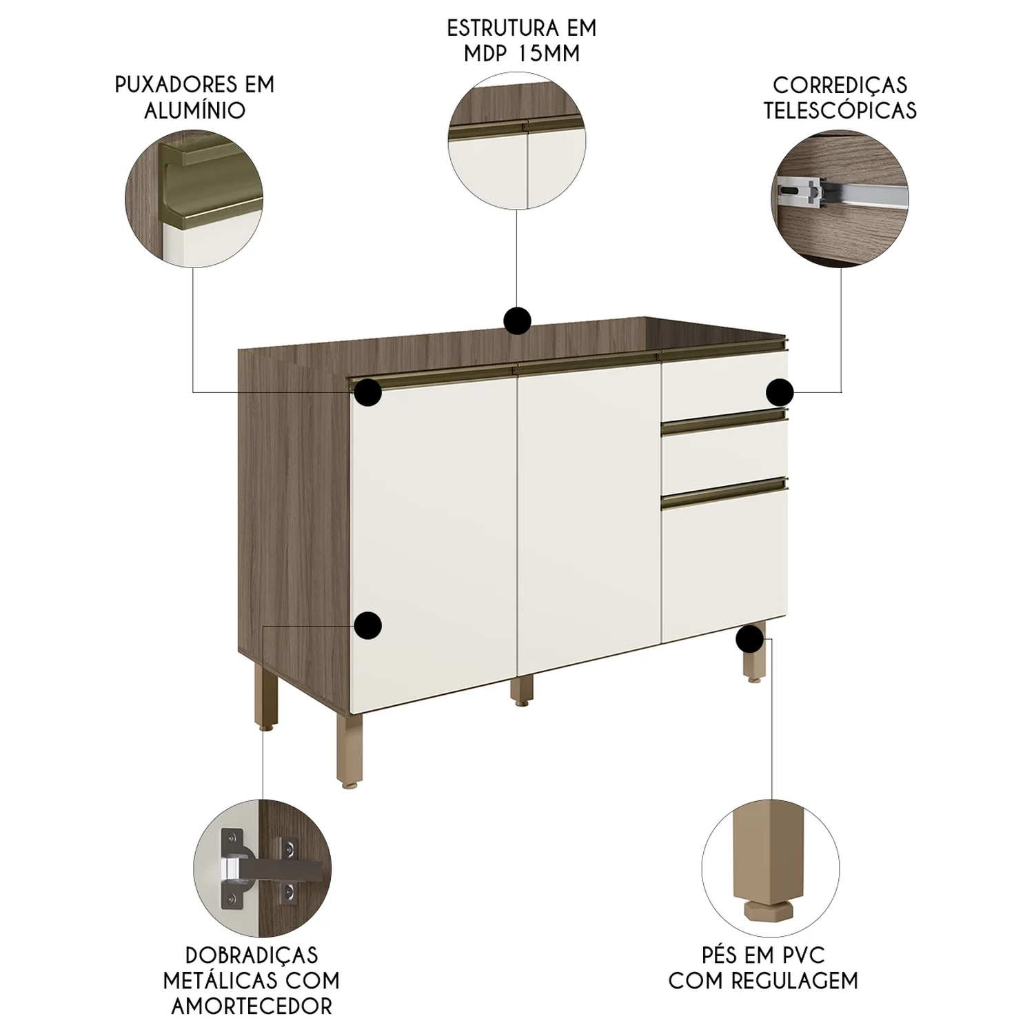 O Balcão de Cozinha oferece duas portas com dobradiças metálicas e amortecedores integrados, garantindo um fechamento suave e silencioso. Além disso, conta com três gavetas espaçosas, incluindo um gavetão, todas equipadas com corrediças metálicas telescópicas que proporcionam uma abertura e fechamento suaves. Os puxadores em alumínio adicionam um toque de sofisticação ao design do Balcão Gabinete, enquanto os pés em PVC reguláveis permitem o ajuste perfeito à altura desejada, assegurando estabilidade mesmo em pisos irregulares. Este tipo de balcão é ideal para quem busca qualidade, durabilidade e um visual refinado na organização da cozinha.