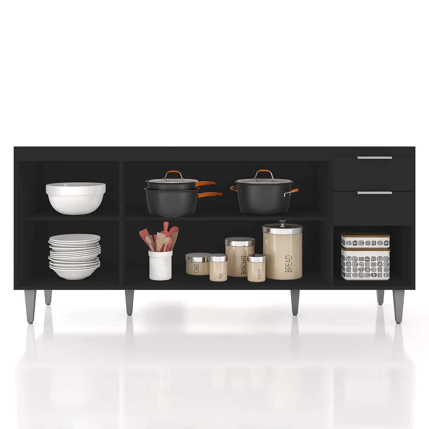 Dispõe de quatro portas com dobradiças metálicas, que proporcionam uma abertura suave, além de duas gavetas com corrediças metálicas. O Balcão Gabinete também se destaca pelos puxadores em alumínio, que adicionam um toque de sofisticação e elegância ao ambiente. Possui estrutura em MDP 15mm, com acabamento em BP, garantindo maior resistência e durabilidade. O Balcão de Cozinha não acompanha tampo para que o uso fique opcional com tampo ou pia. Conta com uma prateleira interna que otimiza o espaço e é uma excelente solução para organizar seus itens de maneira eficiente, acomodando mantimentos, panelas e outros utensílios. Os pés em PVC, são reguláveis, permitindo ajustar pequenos desníveis de piso e manter a estabilidade do produto.