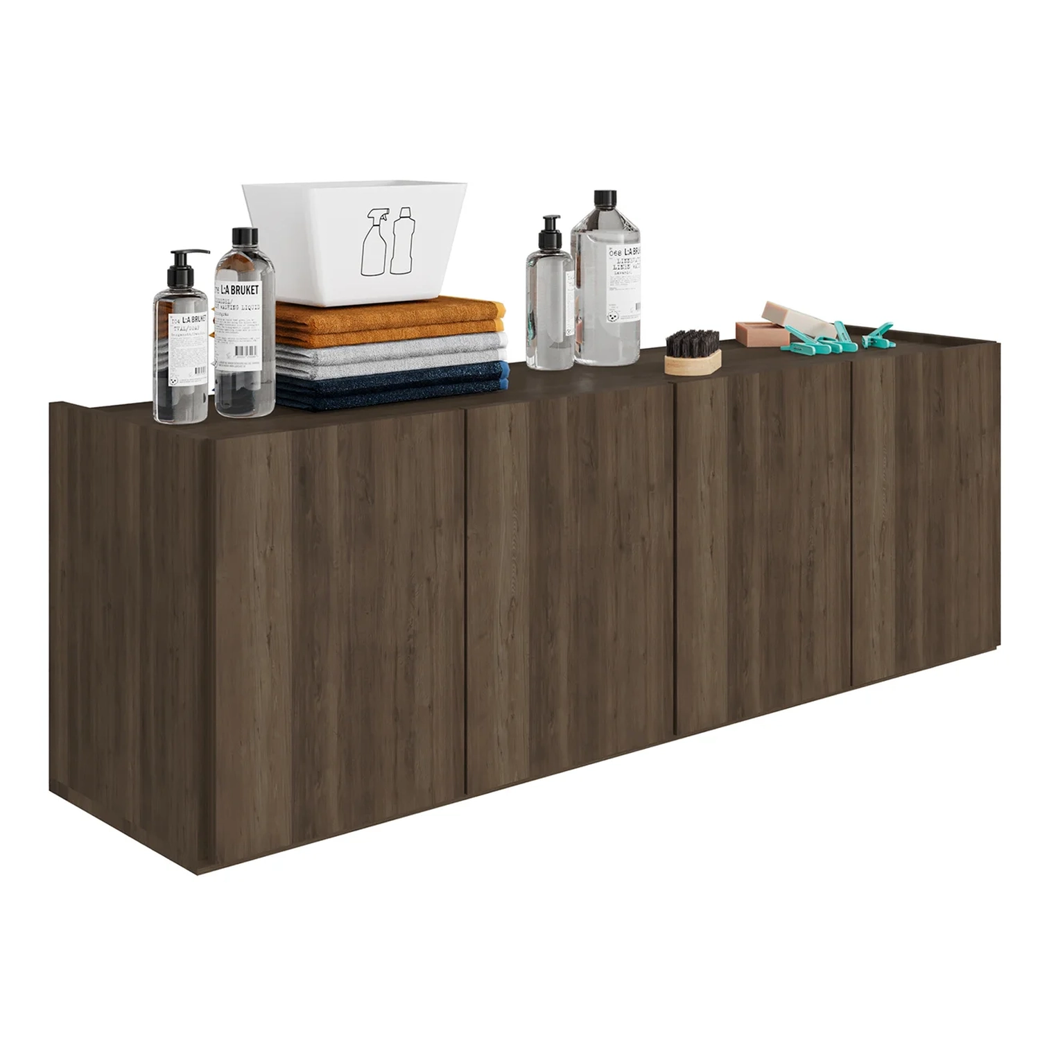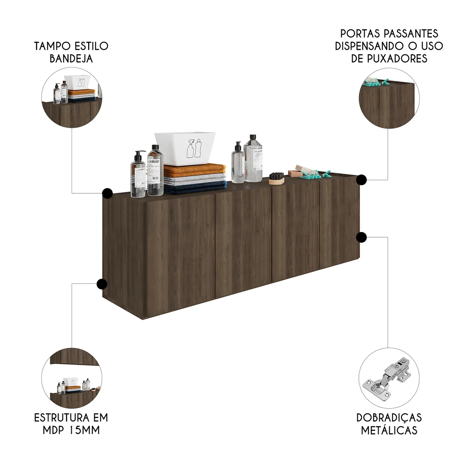 O Balcão Suspenso quatro portas é a escolha ideal para quem busca versatilidade e organização com um design moderno e funcional. Com 118cm de largura e um amplo espaço interno, ele acomoda com facilidade diversos itens de Lavanderia, como produtos de limpeza, balde, panos, entre outros.
