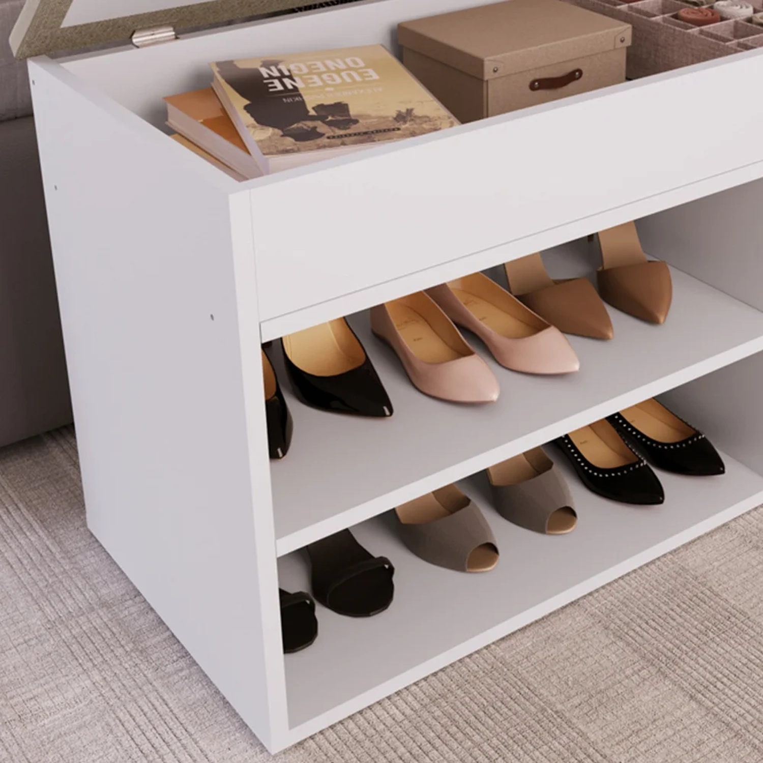 O Banco sapateira é um móvel fabricado em madeira de qualidade e sinônimo de praticidade graças ao seu design versátil que pode ser utilizado nos pés da cama, closet e auxiliar em cômodos variados de acordo com as necessidades do seu dia a dia. O modelo de sapateira SP08 Branca da Completa Móveis conta com prateleira formando nichos para colocar seus pares de sapatos, tampo estofado que serve como banco e o melhor: um baú!