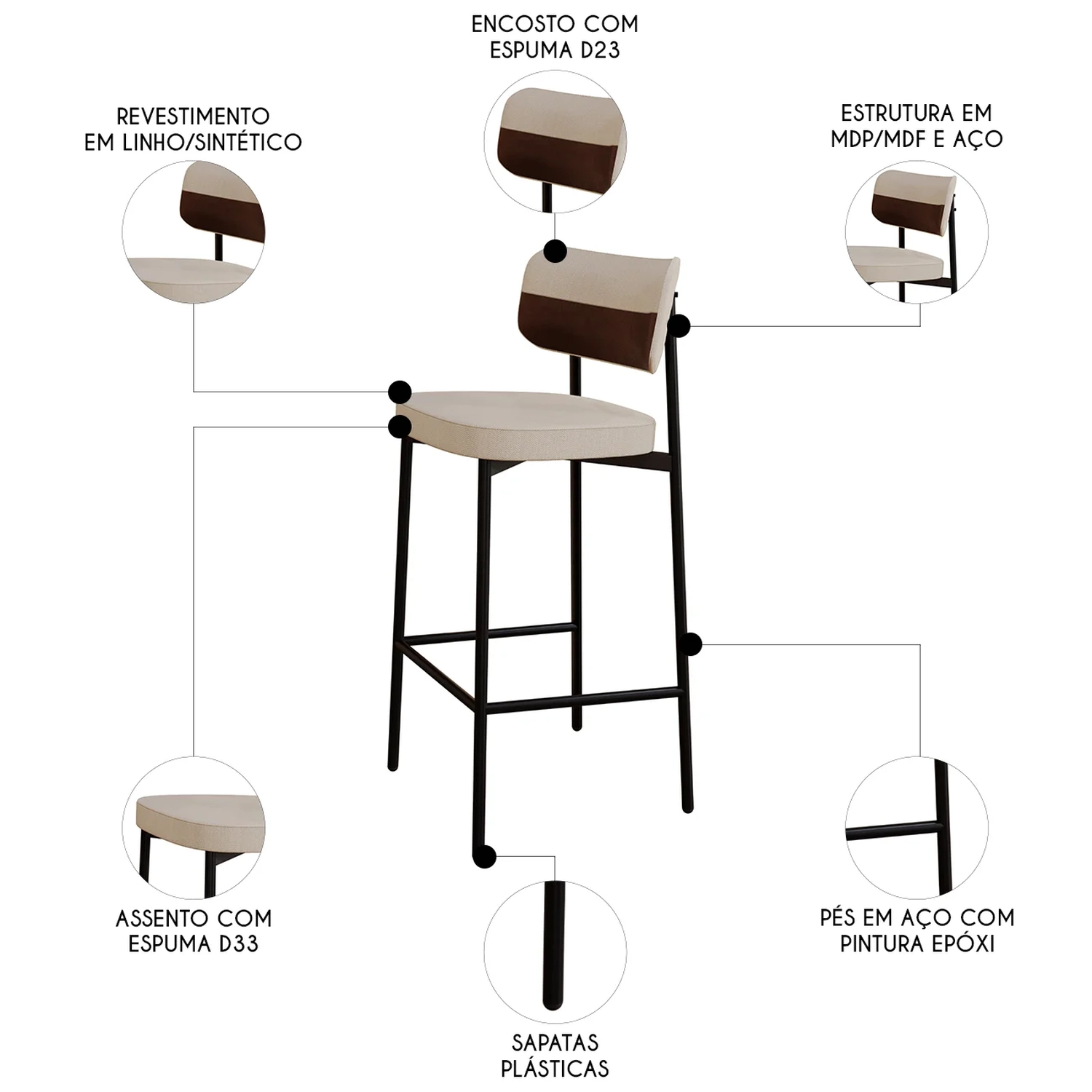 O revestimento em linho com detalhe em sintético do kit de banquetas oferece um toque sofisticado, enquanto o assento em espuma D33 proporciona um conforto superior, adequado para longos períodos de uso. O encosto curvado com espuma D23, complementa a experiência de conforto e estabilidade. Produzida com MDF/MDP no assento e encosto, a banqueta garante robustez e resistência. A estrutura em aço com pintura epóxi da Banqueta Para Bancada assegura durabilidade, tornando-a ideal para ambientes dinâmicos, como Cozinhas, bares e áreas gourmet. Sua combinação de design moderno e materiais de alta qualidade faz da Banqueta Cozinha uma excelente escolha para quem busca praticidade, estilo e longevidade em seus móveis.