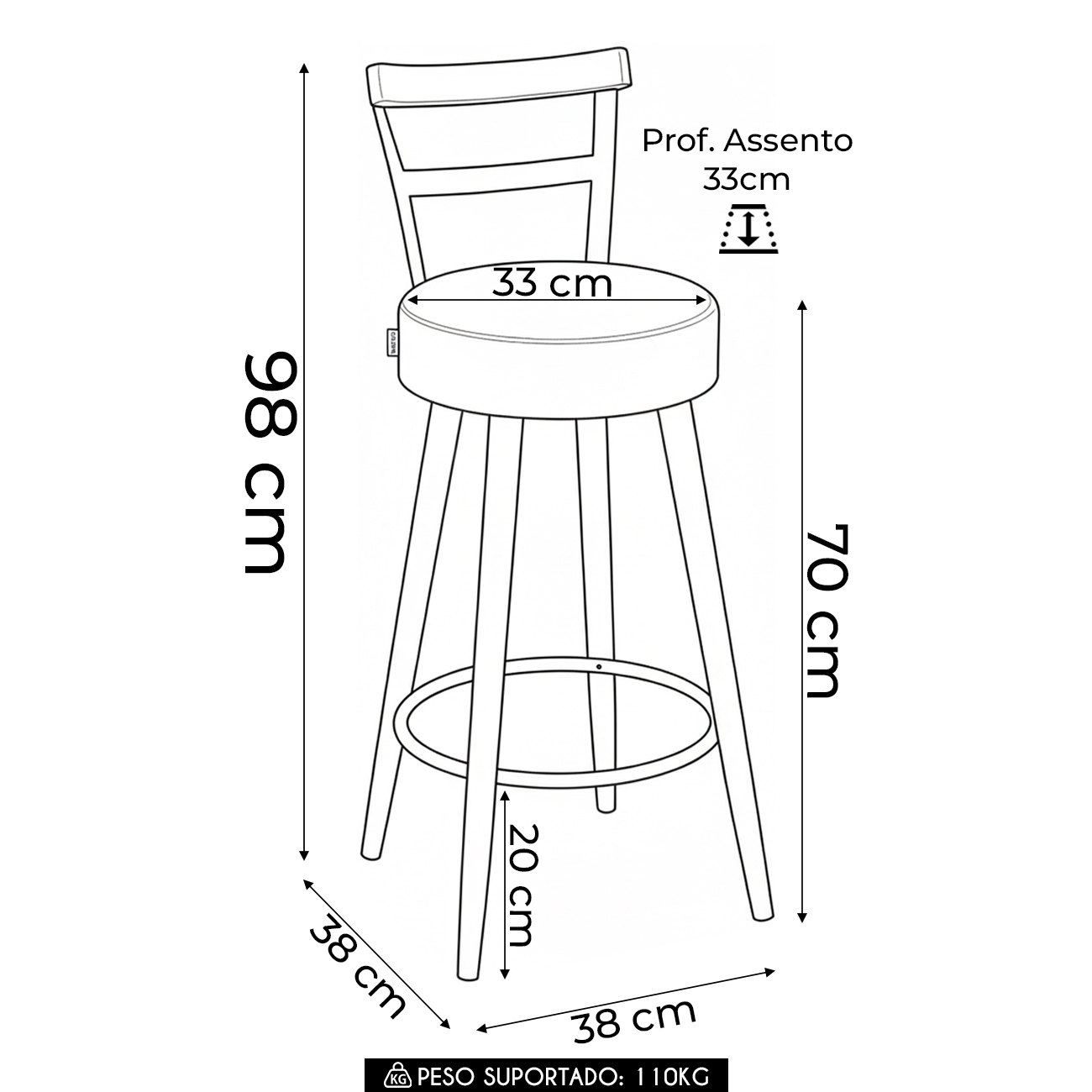 Altura do assento: 70 cm.