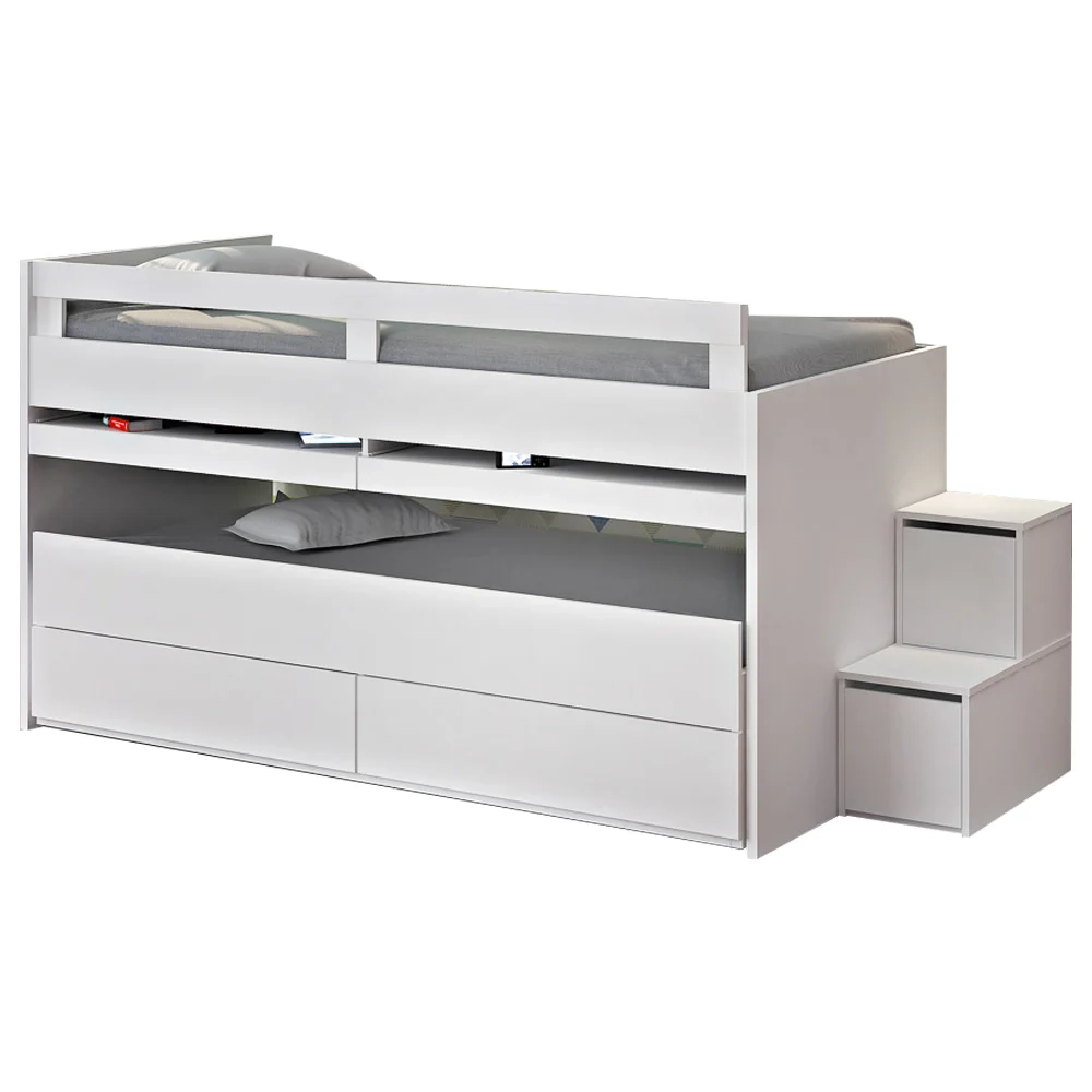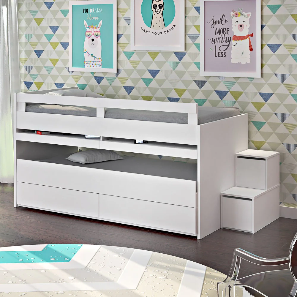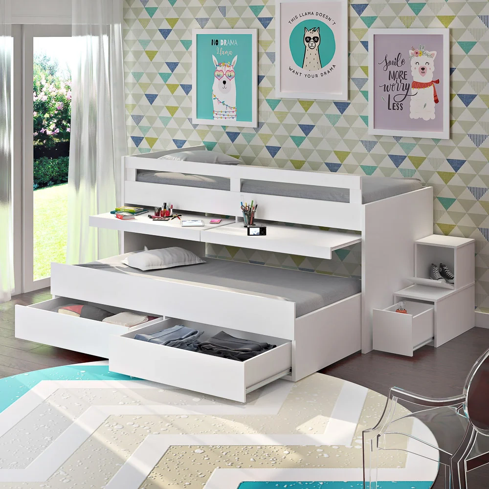 Mas com a beliche Faces da Mpozenato a tarefa de deixar esse ambiente funcional e agradável está garantida! O móvel conta com escada 2 em 1, pois além de auxiliar o acesso na cama superior, também contém 1 gaveta e 1 porta basculante para guardar acessórios, brinquedos, calçados e o que mais preferir. A multifuncionalidade não para por aqui, pois ainda conta com 2 gavetas grandes com corrediças telescópicas e 2 escrivaninhas retráteis que dão um toque único ao ambiente. Com tantas vantagens assim, fica bem mais fácil organizar o necessário sem abrir mão do conforto tão estimado! Isso porque, além de otimizar o quarto de solteiro, o design moderno do móvel dá um charme ímpar de sofisticação para o cômodo.