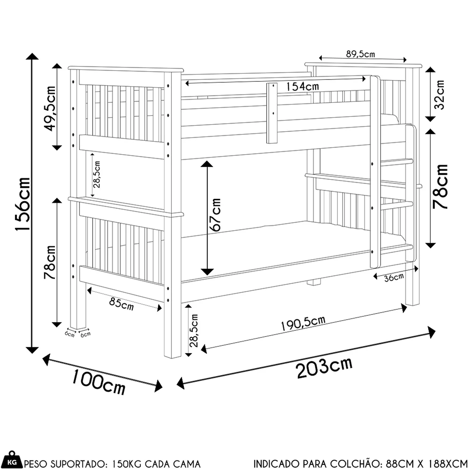 Peso Suportado: 150 kg distribuídos em cada cama.
