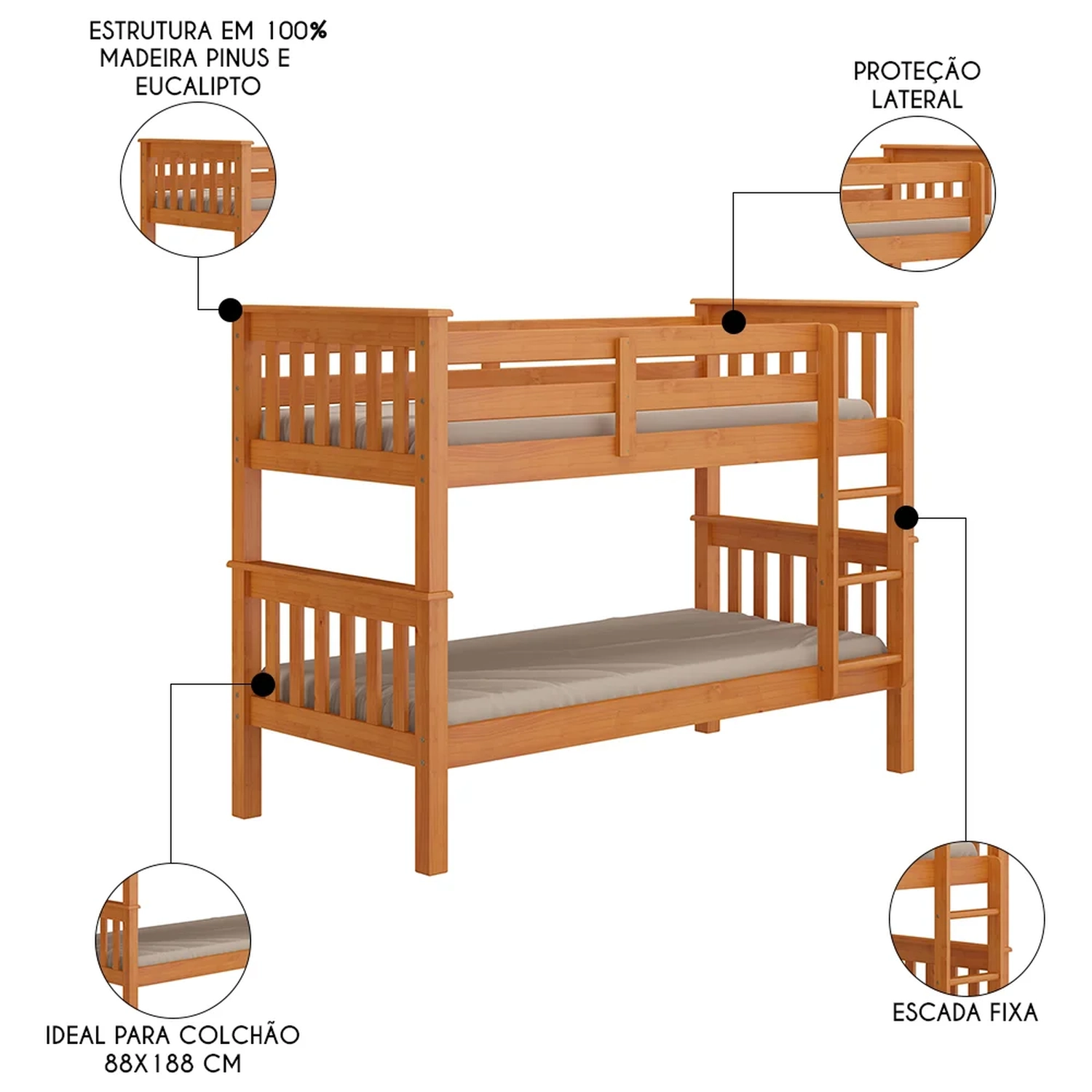 Já a qualidade, fica por conta da estrutura 100% madeira maciça, proporcionando firmeza e estabilidade, enquanto a escada fixa assegura o acesso para a parte superior, ou seja, segurança completa para aqueles que você ama. Além disso, o quarto ficará mais organizado e com melhor espaço de circulação, já que aproveita a altura do ambiente, sendo perfeito para quartos pequenos.