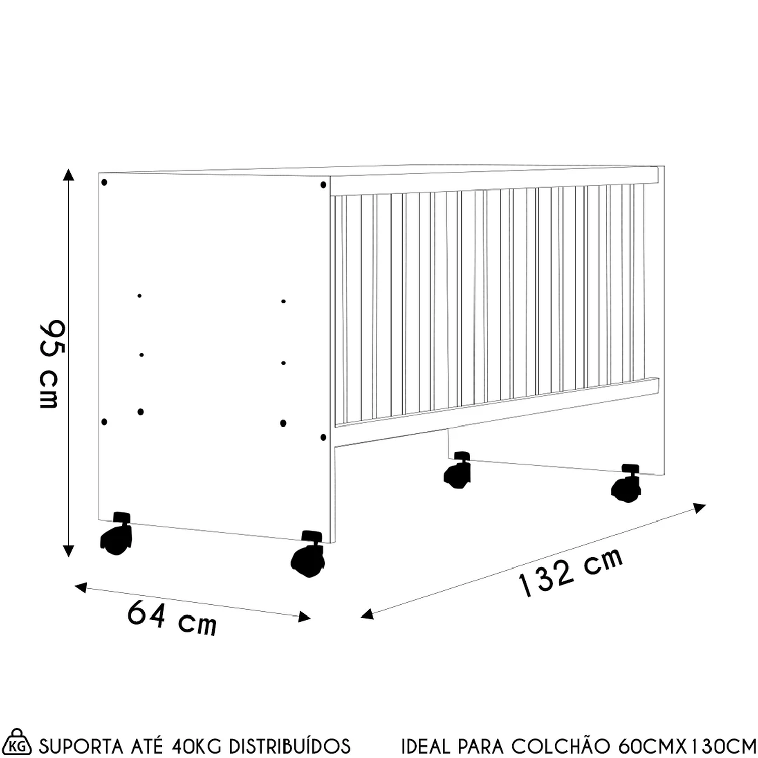O modelo inclui kit de pés com rodízios, sendo duas travas e duas sem travas, facilitando deslocamento e limpeza. O design pensado ergonomicamente oferece Conforto e contribui para a Harmonia do ambiente infantil.