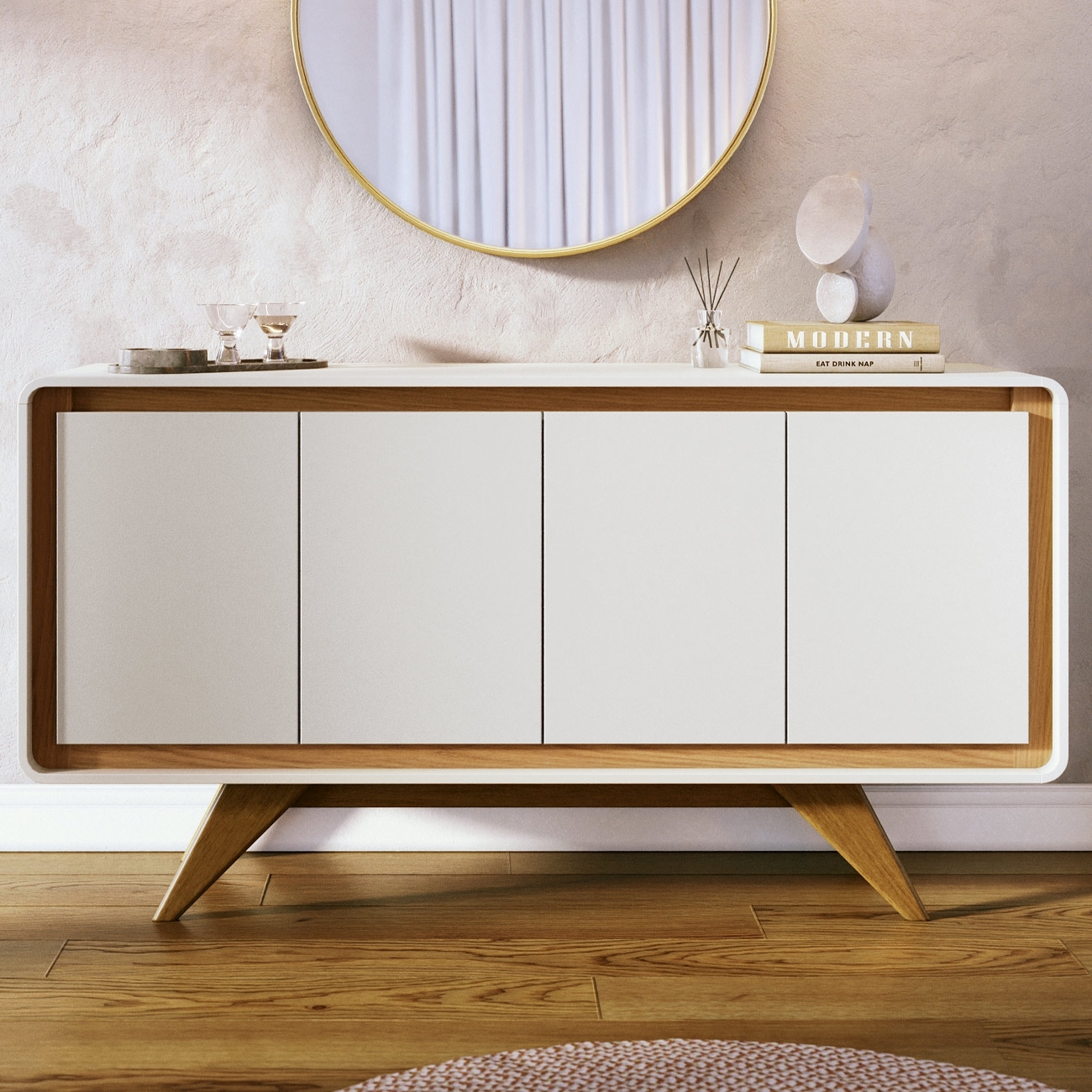 O visual com cantos curvos, puxadores cava e linhas suaves destaca o Design Orgânico, criando um Móvel que valoriza o ambiente com equilíbrio e sofisticação.