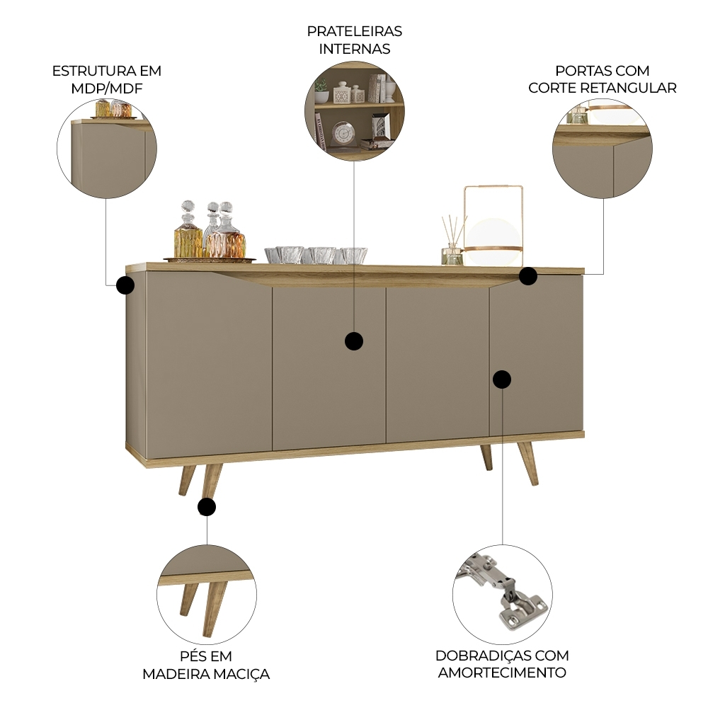 A estrutura do Buffet Aparador conta com base e tampo em chapa de 25mm, enquanto as portas em chapa de 15mm possuem dobradiças metálicas de 35mm com amortecimento, garantindo fechamento suave e silencioso.