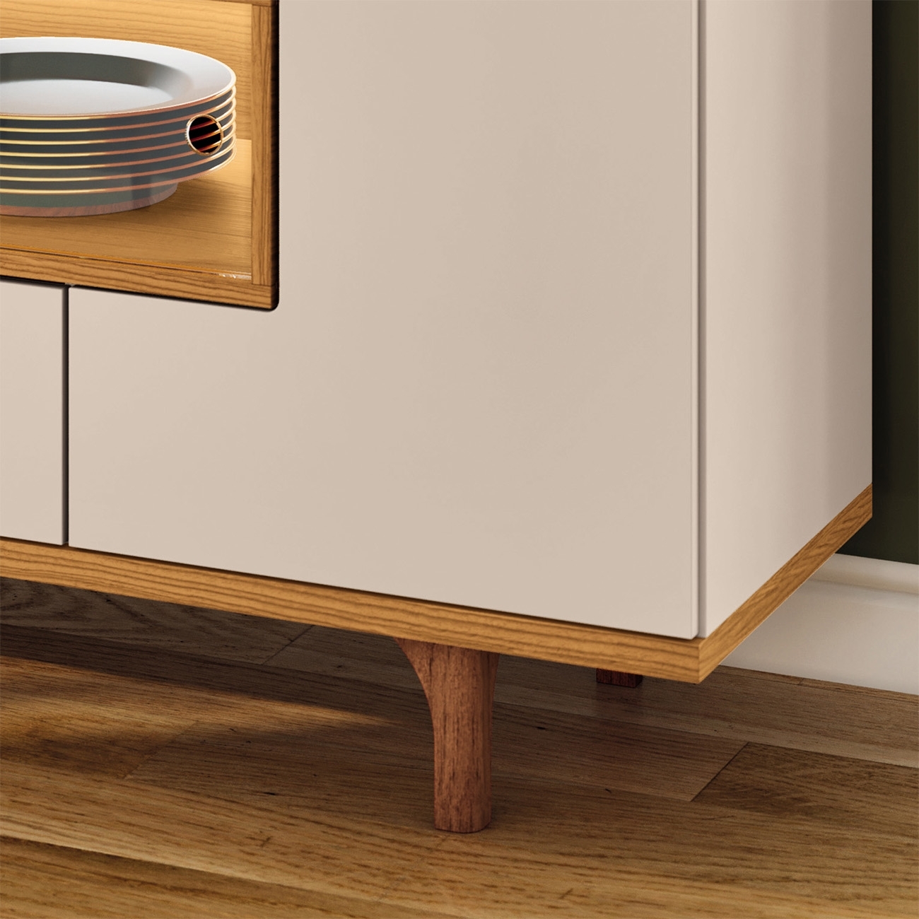 As portas laterais do Buffet possuem design integrado que emoldura o nicho central, enquanto a porta basculante superior e a gaveta inferior com corrediças telescópicas garantem organização prática no dia a dia.
