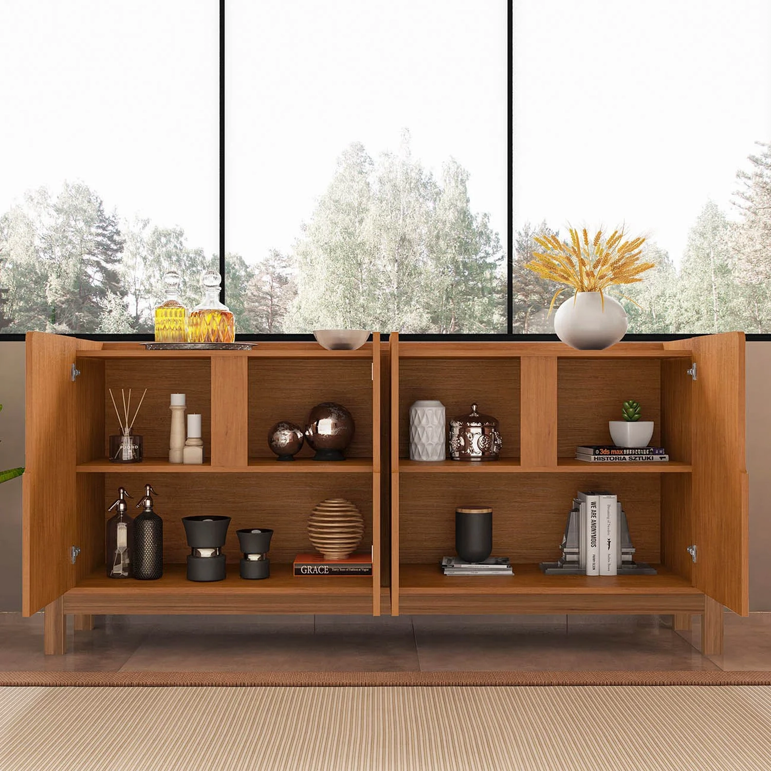 Com quatro portas e duas prateleiras internas, o Buffet Aparador oferece amplo espaço para armazenamento, permitindo que objetos pessoais, aparelhos de jantar e outros itens essenciais sejam organizados com facilidade. A ausência de puxadores e as portas de MDF com detalhes curvos conferem um design moderno ao produto. A robustez é garantida pela estrutura de MDF e MDP de alta qualidade em diferentes espessuras, enquanto a base e as laterais com cantos arredondados suavizam a silhueta do móvel, adicionando um toque de sofisticação a Sala de Estar. As dobradiças metálicas Soft Close são um detalhe que reflete o cuidado com o conforto e a durabilidade, assegurando um fechamento suave das portas. A estrutura dos pés em madeira maciça não só proporciona estabilidade, mas também acrescenta um elemento natural, harmonizando com diversos estilos de decoração.