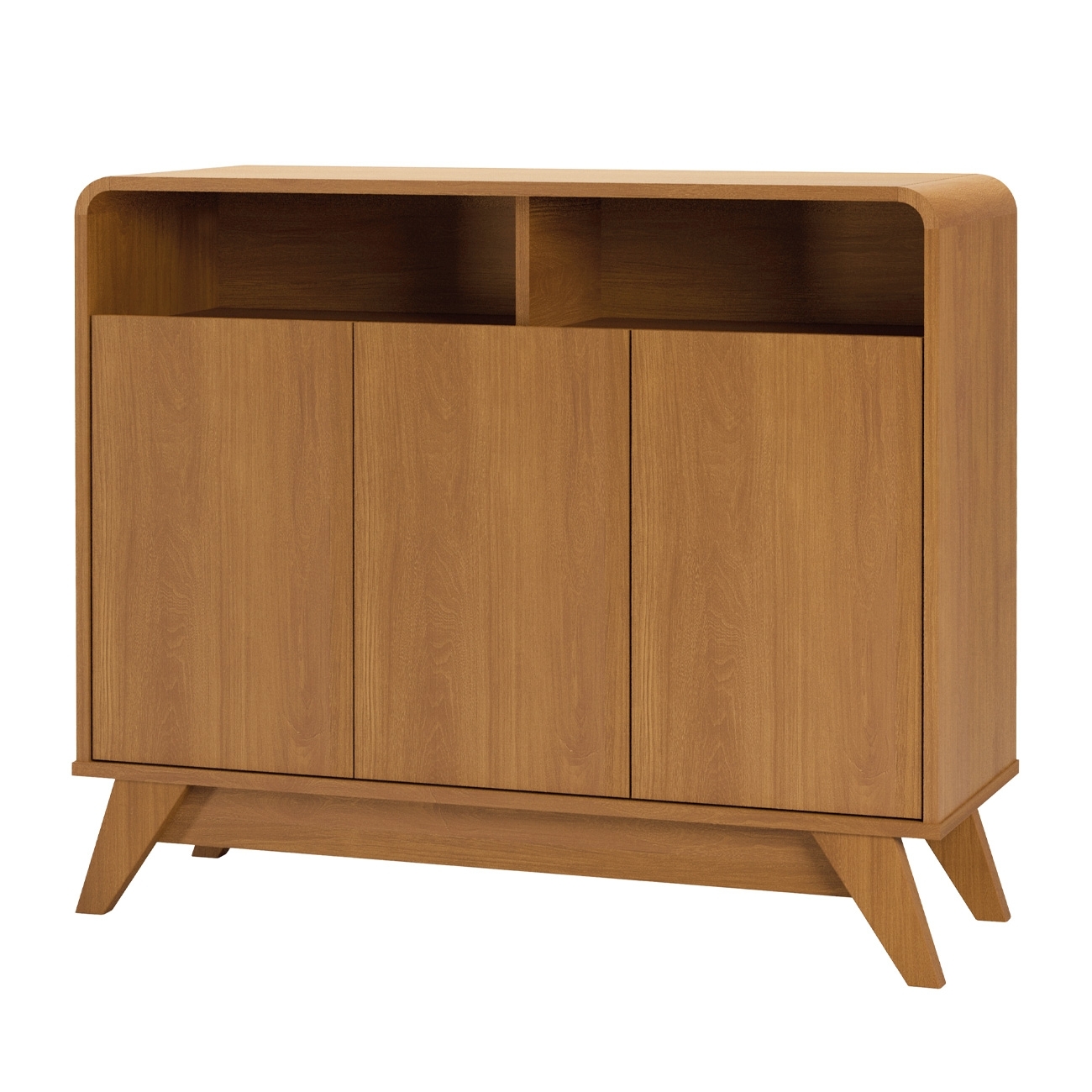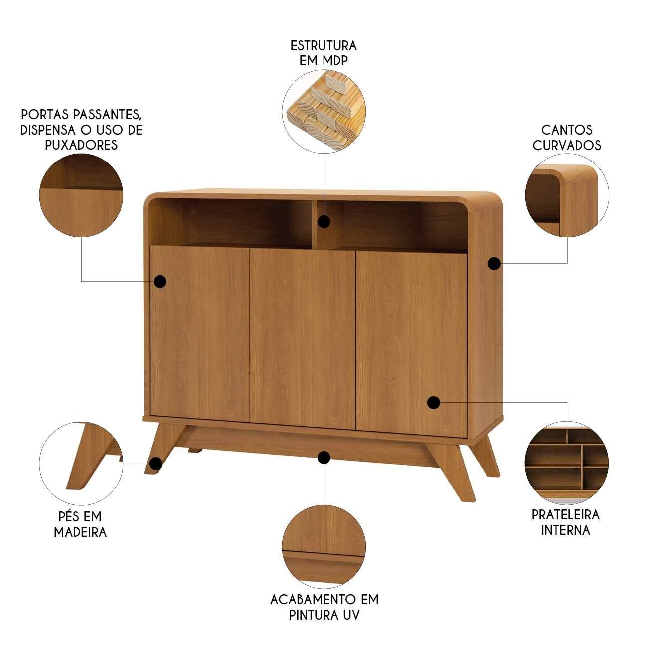 A estrutura em MDP garante resistência e estabilidade no uso diário, enquanto os cantos curvos reforçam o apelo estético do Buffet Aparador, criando uma composição moderna e agradável visualmente.