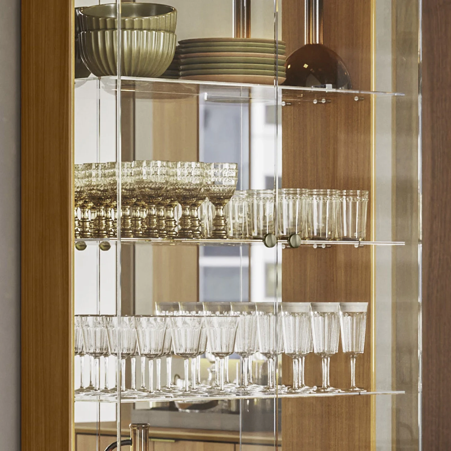 A Cristaleira Porta de Vidro é elegante e prática, com laterais curvas, espelho ao fundo e tampo chanfrado. As portas de vidro, iluminadas por LED, exibem objetos decorativos com sofisticação, enquanto as portas inferiores em MDF oferecem espaço para armazenamento discreto.